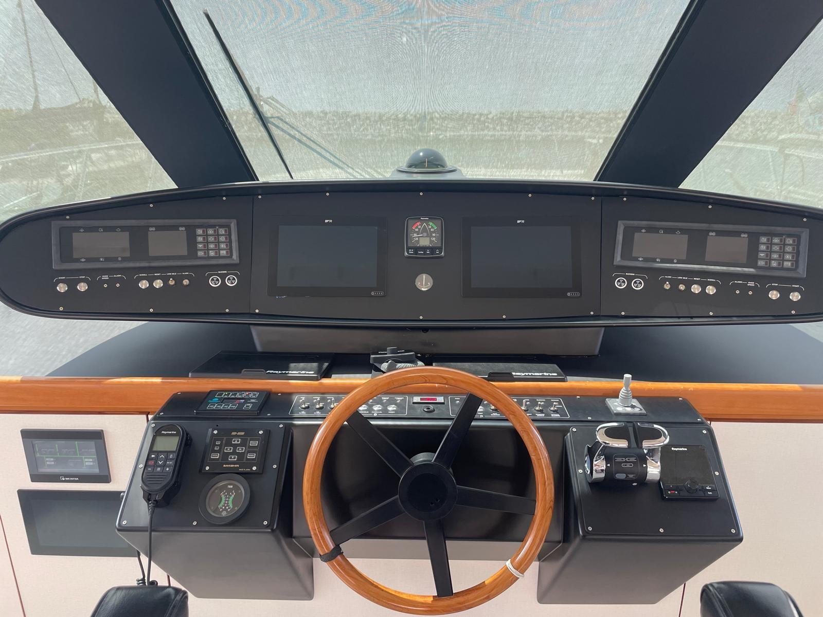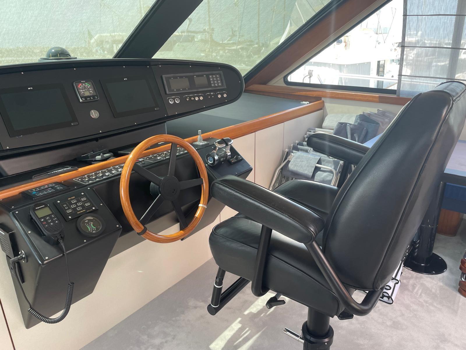 Alarme moteur, Alarme de pompe de cale, Alternateur, Eau sous pression, Système de vidange, Douche de cockpit, Double barre à roue, Phare de poursuite, Flaps hydrauliques, Bossoirs pour annexe, Extincteur(s) fixe(s), Indicateurs de flaps, Passerelle, Plateforme arrière, Porte latérale, Prise de quai, Connexion eau sous pression à quai, Rollbar, Guindeau électrique, Echelle de bain, Selles pour Annexe, table de cockpit, Annexe, Corne, Winch électrique arrière.