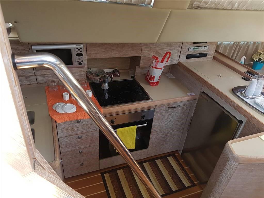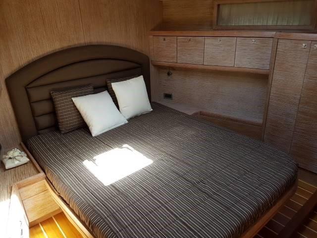 Grand cockpit avec table - dinette avec canapés, table et cuisine - table et station de cartes - version avec cabine principale avec lit double et salle de bain à l’avant - cabine invités avec deux lits plats et salle de bain - cabine invités avec deux lits plats au milieu du bateau tous deux vers la poupe - cabine invités avec deux lits superposés - salle de bain invités partagée entre la cabine avec lits superposés et la cabine avec lits plats.