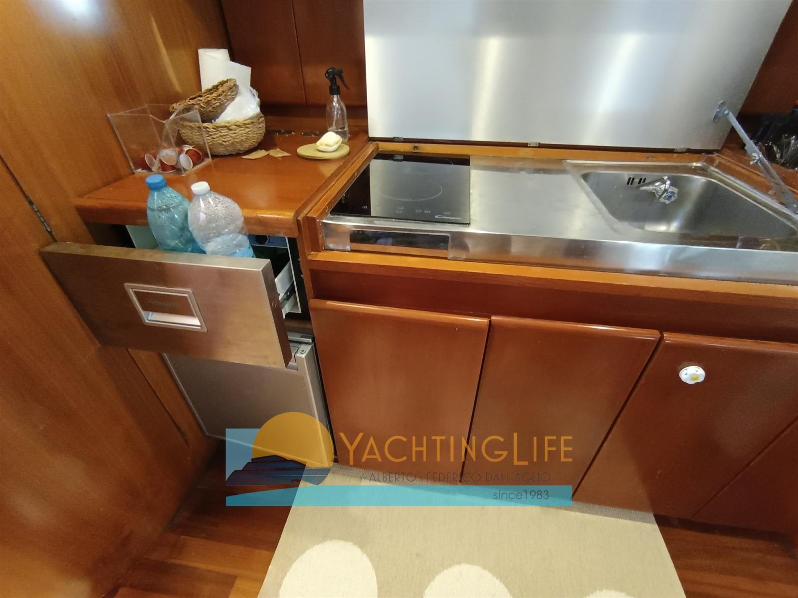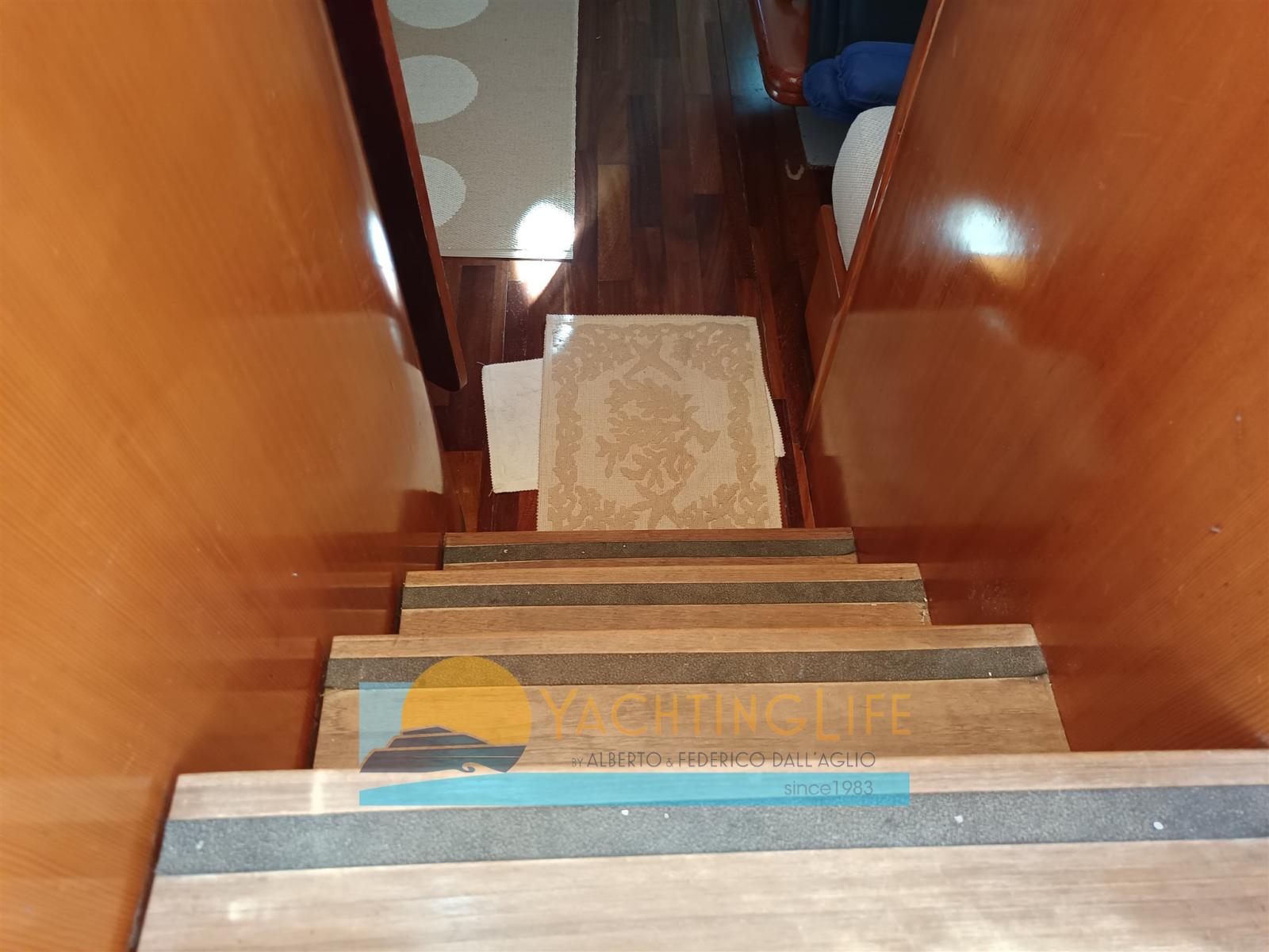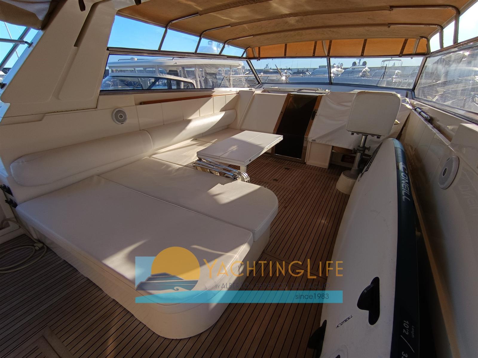 Alarme moteur, Eau sous pression, Douche de cockpit, Propulseur d'étrave (QL), Flaps hydrauliques, Extincteur(s) fixe(s), Éclairage de courtoisie, Moteur d'annexe (Honda), Passerelle (Idraulica), Plateforme arrière (Allungata, rivestimento in flexiteak), Pompe de cale automatique, Porte latérale, Cockpit en teck, Prise de quai, Rollbar, Guindeau électrique, Echelle de bain, table de cockpit, Annexe, Corne.