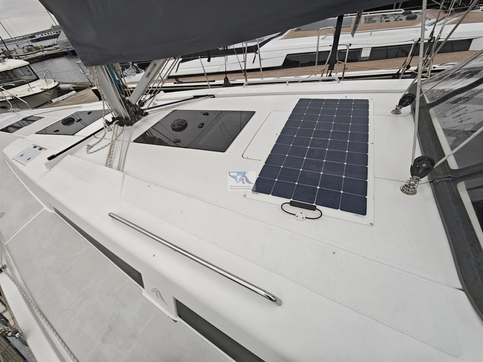 Ancre (Delta 16kg mit 30m galvanisierter Kette), Eau sous pression, 3 Batteries (je 160 Ah AGM), Douche de cockpit (warm/kalt), Double barre à roue, Propulseur d'étrave (12 V einziehbar inkl. Batterie), Panneau solaire (200 Watt), Plateforme arrière (Badeplattform manuell mit Flexiteak), Cockpit en teck (Flexiteak, auch auf den Cockpitbänken), Prise de quai, Guindeau électrique (mit Fernbedienung und Ankerkettenzähler), Echelle de bain, table de cockpit (mit Staufach und Kühlschrank), 2 Filières avec sortie latèrale, 2 Winch électrique (Lewmar 45 EST Evo Fallwinschen), Windex.
