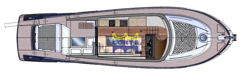 Fly équipé d’un second poste de barre cartographique Garmin. armoire avec plaque de cuisson, réfrigérateur, table avec dinette et plan bimini.