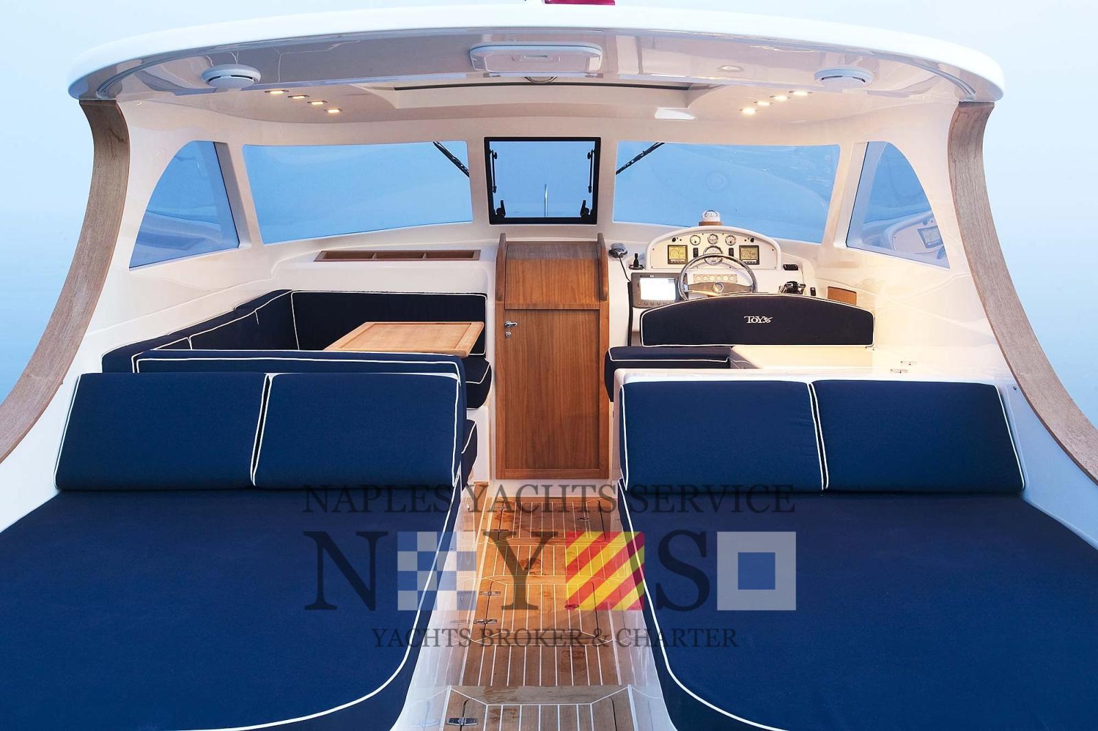 2 Alarme moteur, Alarme de pompe de cale, Eau sous pression, 4 Batteries, Passavant en teck (Fuga grigia), Douche de cockpit, Flaps hydrauliques, Hard top (elettrico), Extincteur(s) fixe(s), Lavage de chaine, Éclairage de courtoisie, Plateforme arrière (con piano di calpestio in teak), 4 Pompe de cale automatique, Porte latérale, Prise de quai, Onduleur, Guindeau électrique, Echelle de bain, table de cockpit, Corne, T-Top.