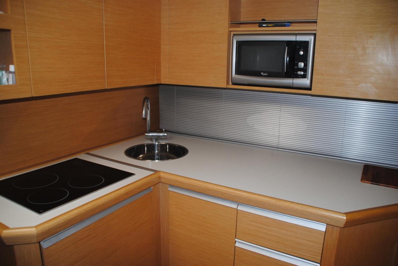Ouverture du compartiment moteur électrique, Eau sous pression, 5 Batteries, Flaps hydrauliques, Garage à annexe, Passerelle (A scomparsa Besenzoni), Plateforme arrière (Maggiorata teak), Cockpit en teck, Guindeau électrique, table de cockpit.