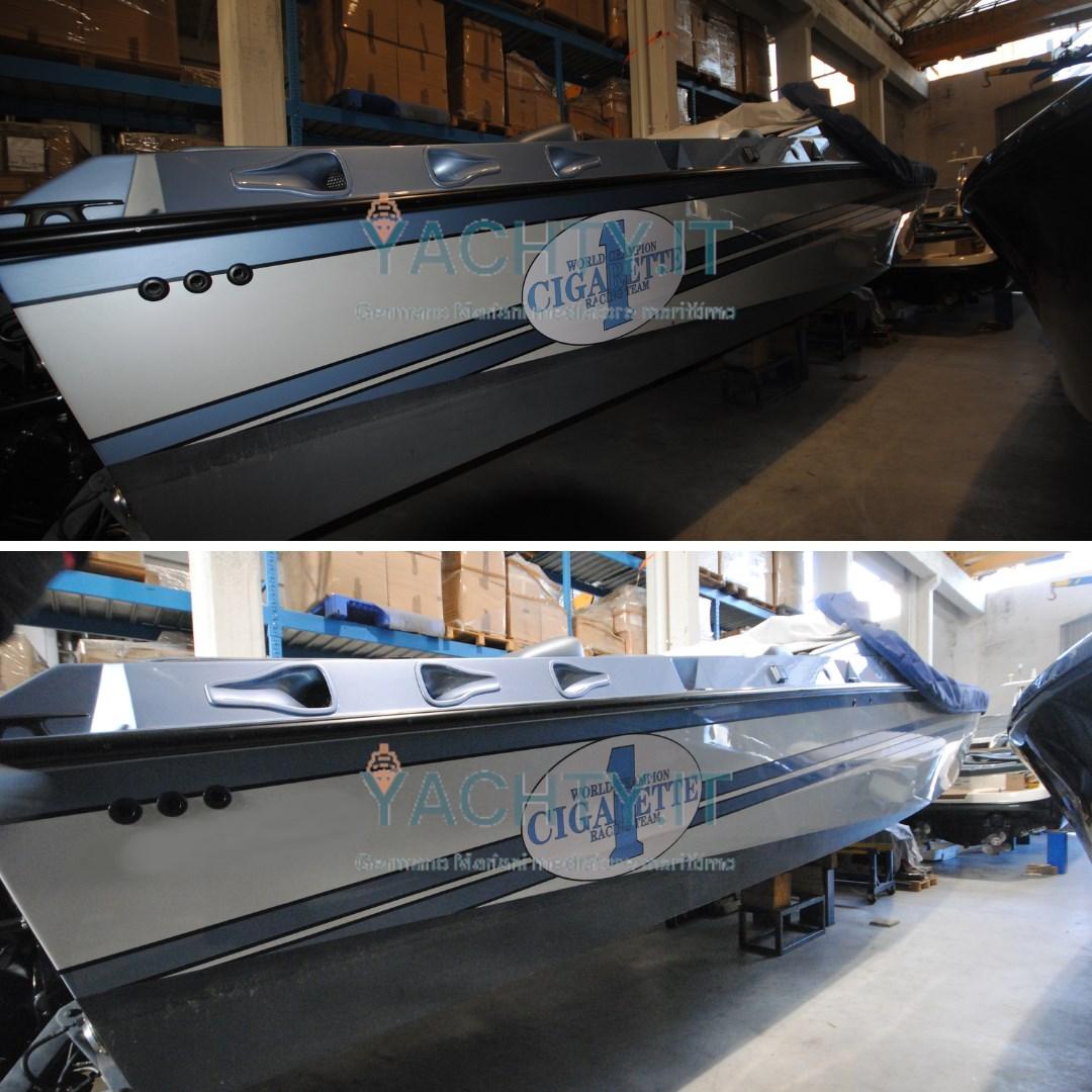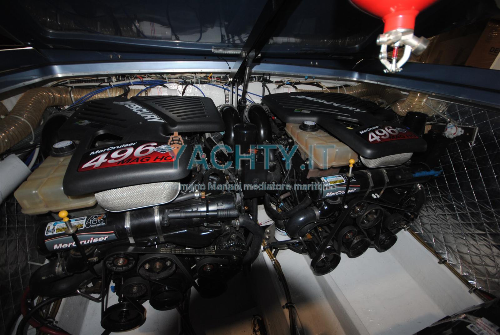 Construite en 1997, propulsée par 2 Mercruiser MCM 496 de 425 ch en 2016, actuellement en 70 heures de moto.
