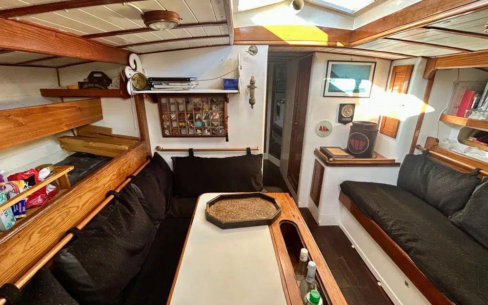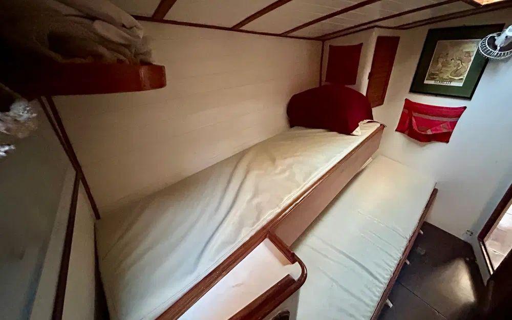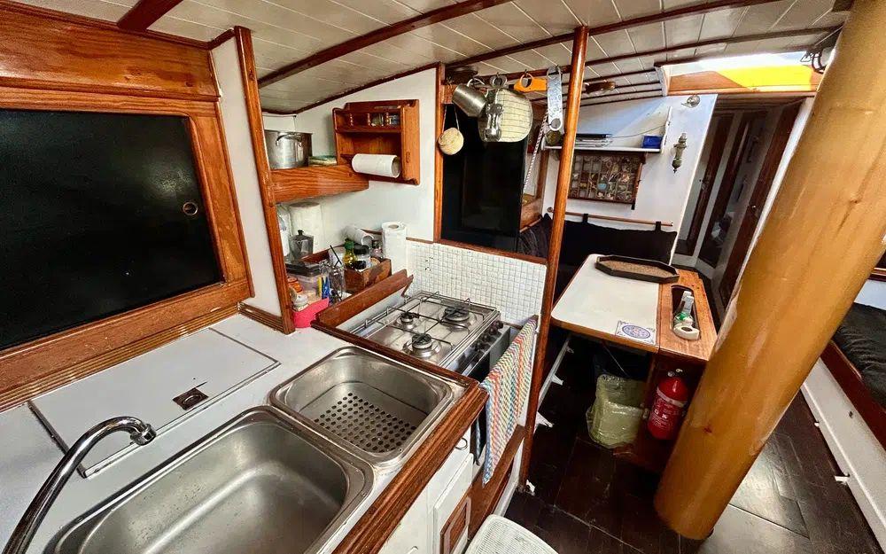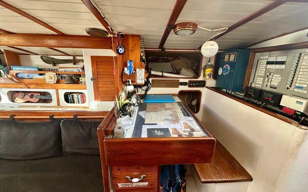 À bord, l’organisation est pensée pour la vie en mer et l’accueil d’équipage. Le bateau dispose de trois cabines équipage avec deux couchettes chacune, ainsi qu’une cabine arrière propriétaire. La cuisine est située à bâbord, avec de nombreux rangements, deux glacières et un petit réfrigérateur, tandis que les couchages tribord complètent l’espace nuit. Deux sanitaires sont présents, un WC manuel à l’avant et un WC électrique en cabine. Les batteries de service sont installées sous le lit tribord de la cabine propriétaire. L’ensemble est complété par une cuve à gasoil de 300 litres, une installation solaire Seatronic avec deux panneaux récents, un groupe portatif, une VHF fixe et mobile, une balise de détresse, ainsi qu’un équipement de navigation comprenant compas et GPS.