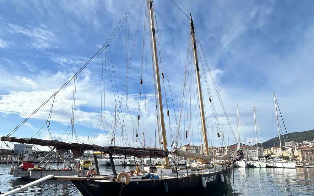La Grande Zot est une goélette aurique de 16 mètres, emblématique du patrimoine maritime d’Ajaccio, qui se distingue autant par son identité forte que par son historique de navigation et son engagement. Avec une longueur totale de 23 mètres depuis la pointe du beaupré jusqu’à l’extrémité de la bôme, et un maître-bau de 4 mètres, elle offre une silhouette élégante et puissante, caractéristique des grandes unités traditionnelles méditerranéennes. Son gréement aurique, composé de deux voiles à corne quadrangulaires et de voiles d’avant triangulaires dont une trinquette bômée, développe environ 166 m² de toile. Les mâts en bois vernis, refaits en 2020 et culminant à 17 mètres depuis la base de quille, participent pleinement à son caractère authentique. Ici, aucune assistance moderne superflue : les manœuvres se font à l’ancienne, sans winch ni enrouleur, avec un système de poulies qui privilégie la sensation de navigation pure et physique.