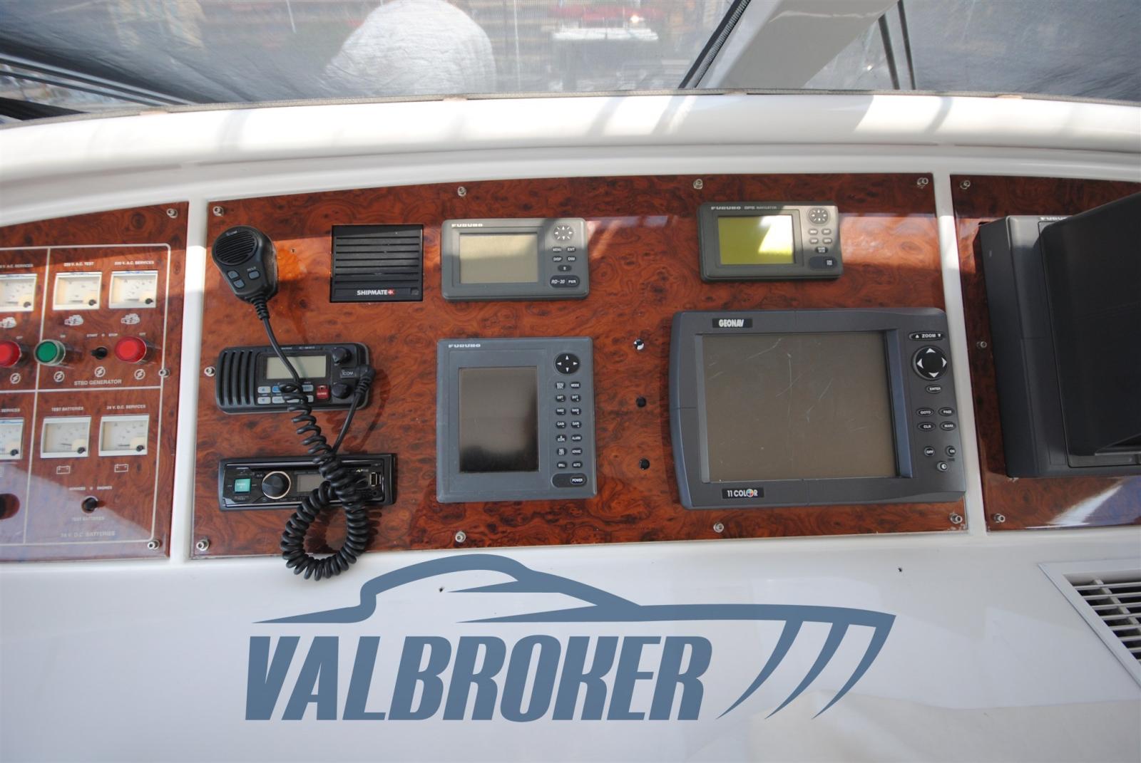 Indicateur d'angle de barre, Moniteur (Furuno), Sondeur pêche (Furuno), GPS (Furuno), Pilote automatique (Simrad AP20), Lecteur de cartes (Navionics Geonav 11 colour), Radar (Furuno), Radio VHF (Icom IC M411).
