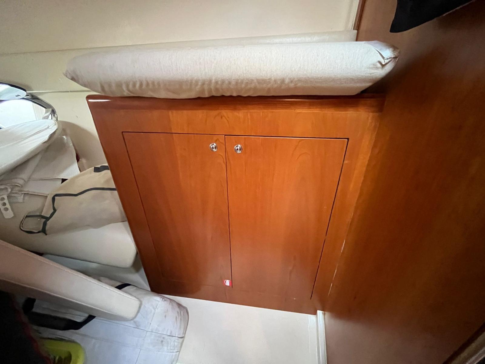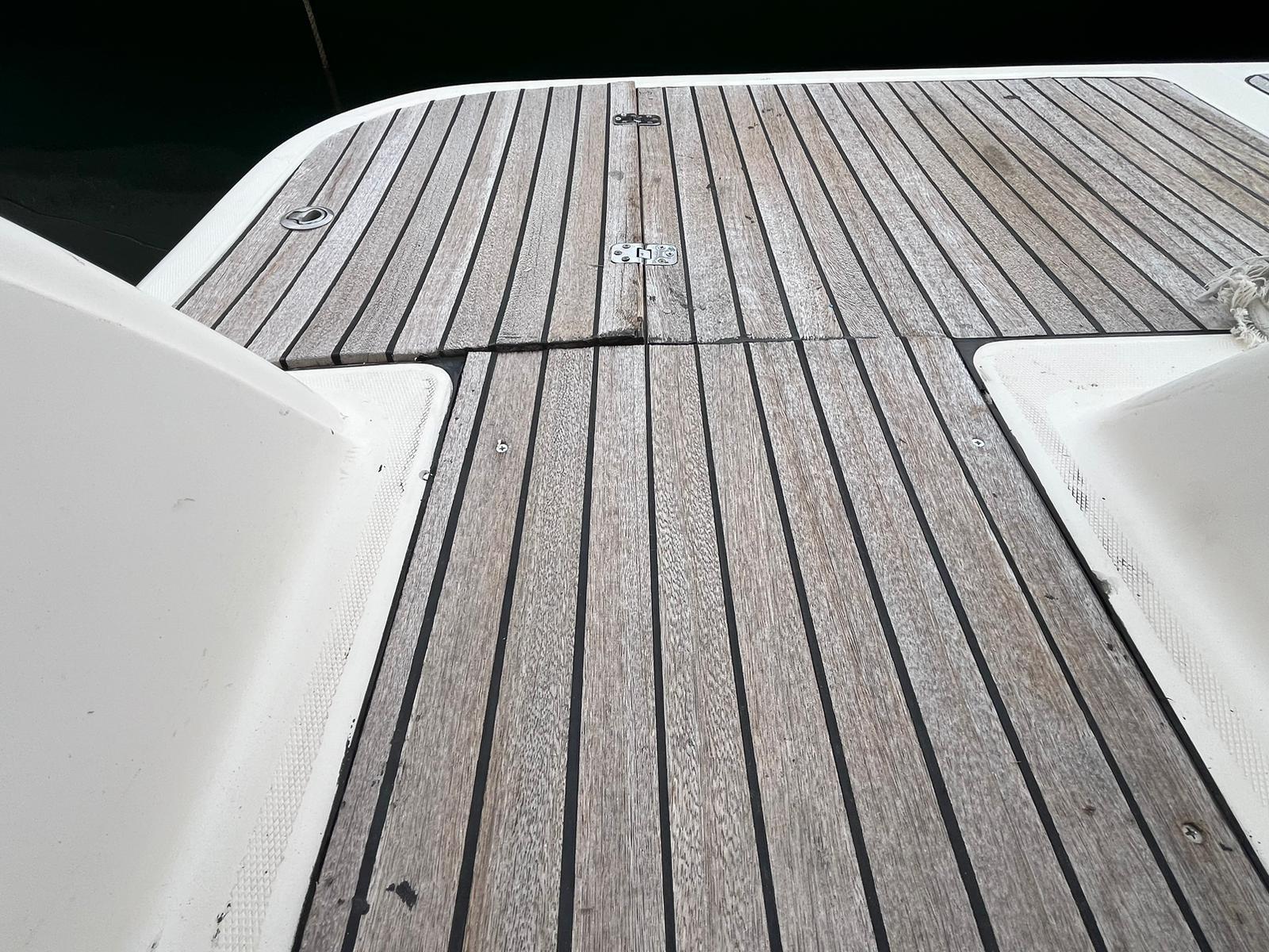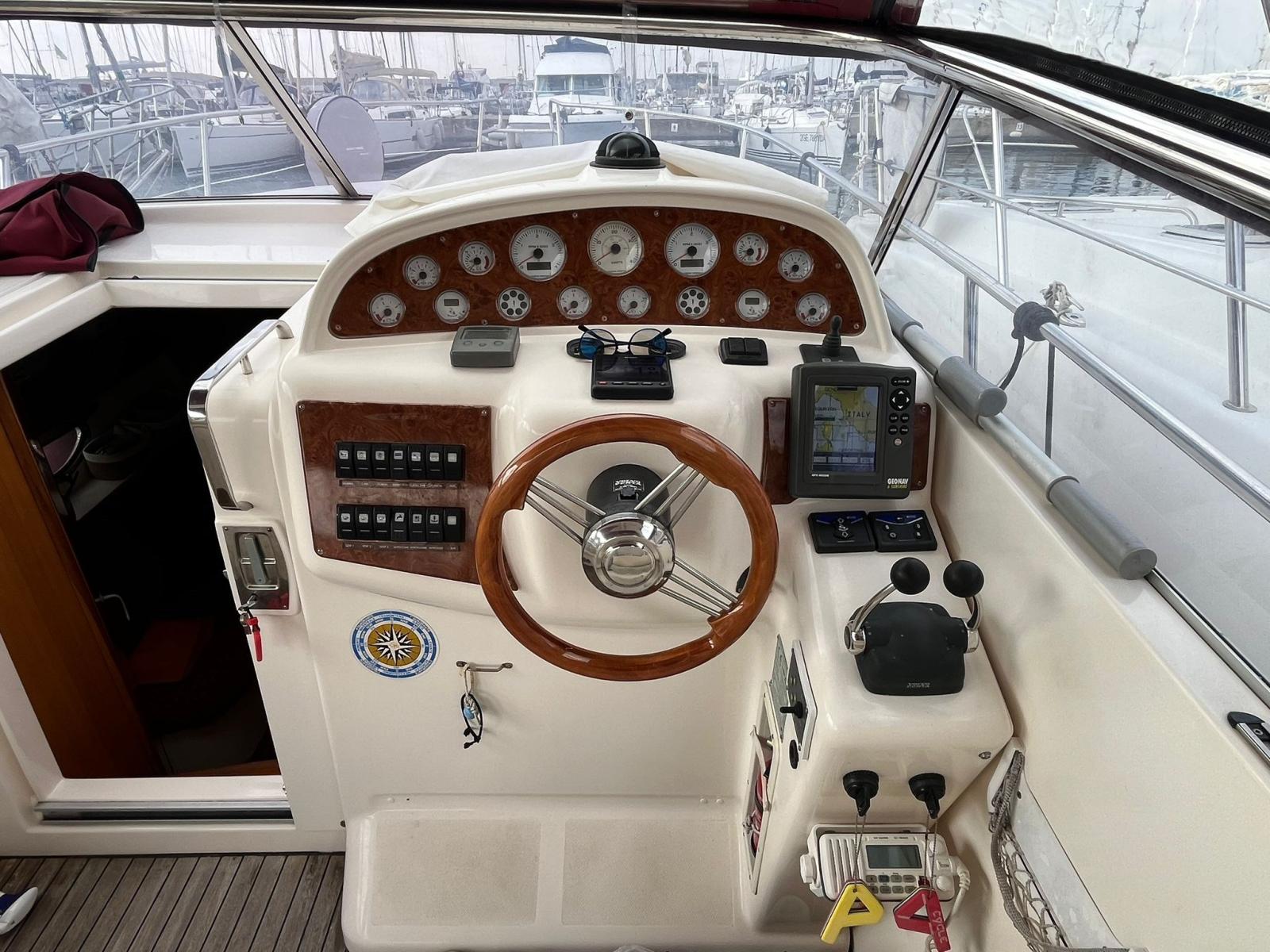 Alarme moteur, Eau sous pression, Phare de poursuite, Flaps hydrauliques, Lavabo dans le cockpit, Panneau solaire, Passerelle (idraulica Besenzoni), Plateforme arrière, Pompe de cale automatique, Pompe de cale manuelle, Cockpit en teck (e piattaforma da rifare), Guindeau électrique, Echelle de bain, table de cockpit.