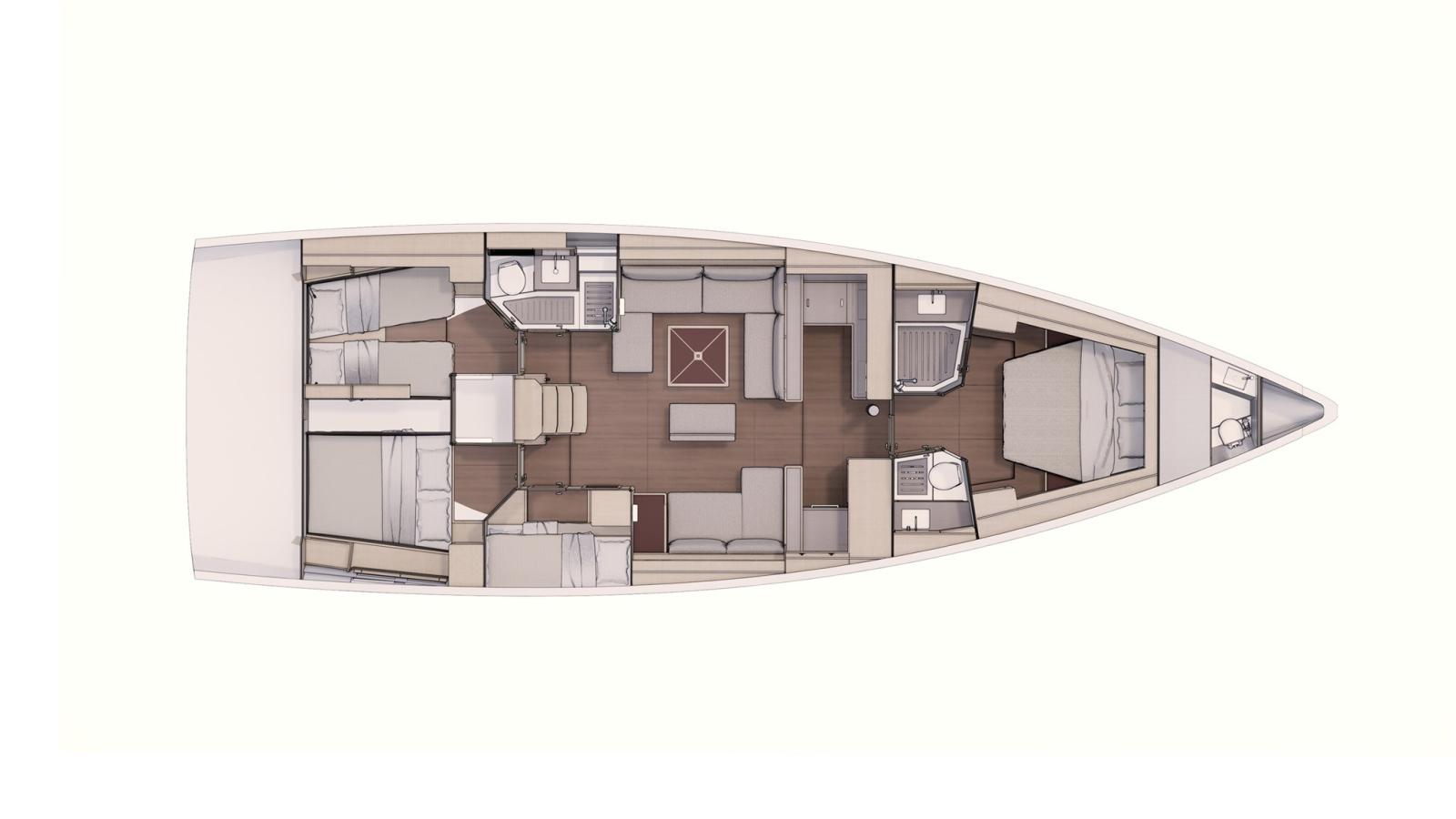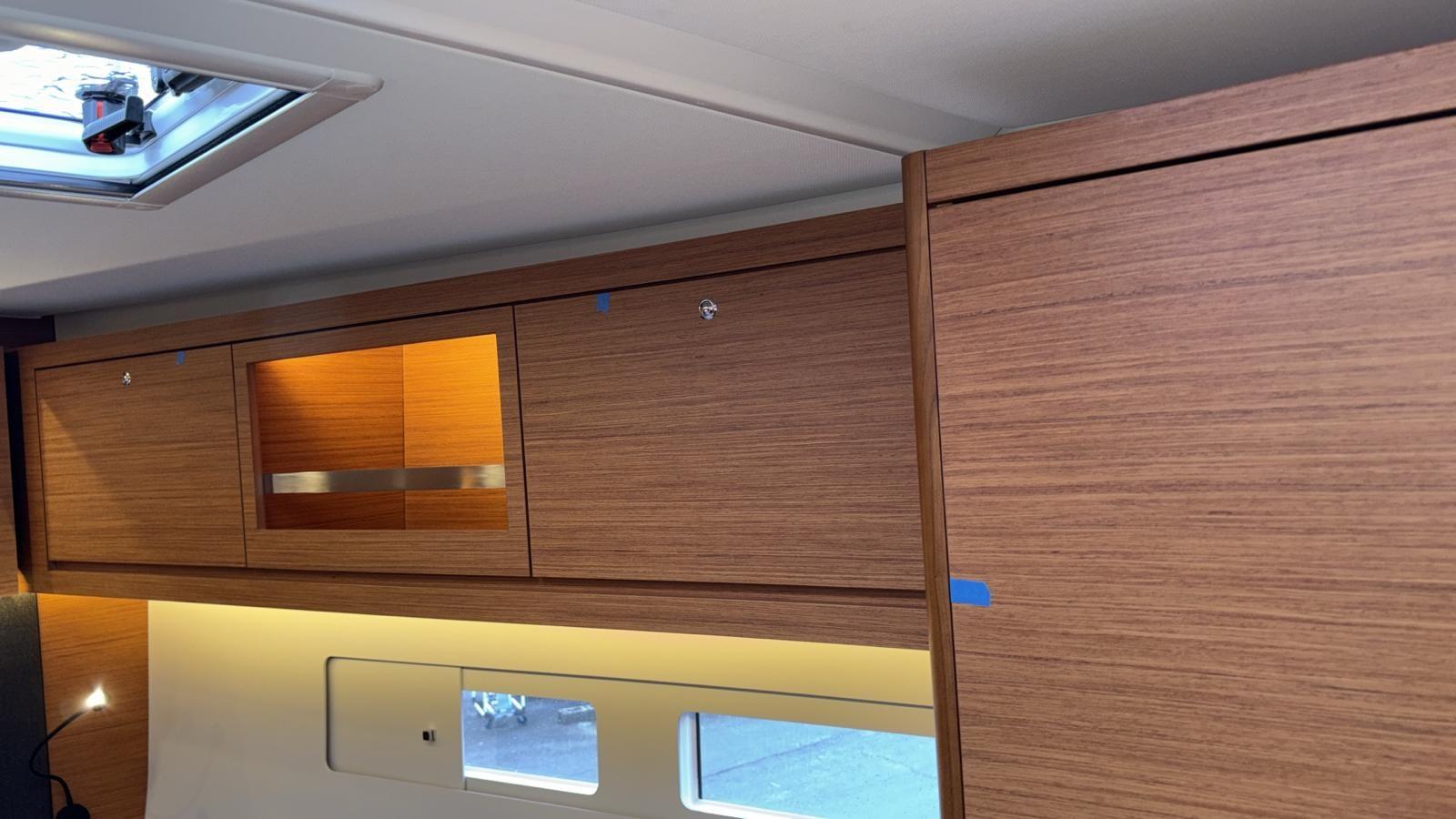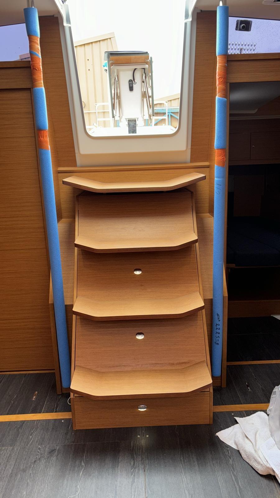 Alarme moteur, Alarme de pompe de cale, Ligne d'arbre de rechange, Eau sous pression, remorque, Douche de cockpit, Double barre à roue, Lavabo dans le cockpit, Plateforme arrière, Pompe de cale automatique, Pompe de cale manuelle, Prise de quai, Connexion eau sous pression à quai, Guindeau électrique, Echelle de bain, Chaise support HB, table de cockpit, Filières avec sortie latèrale.