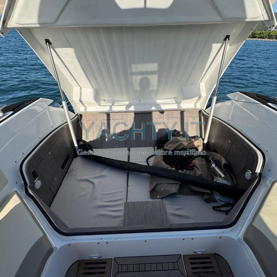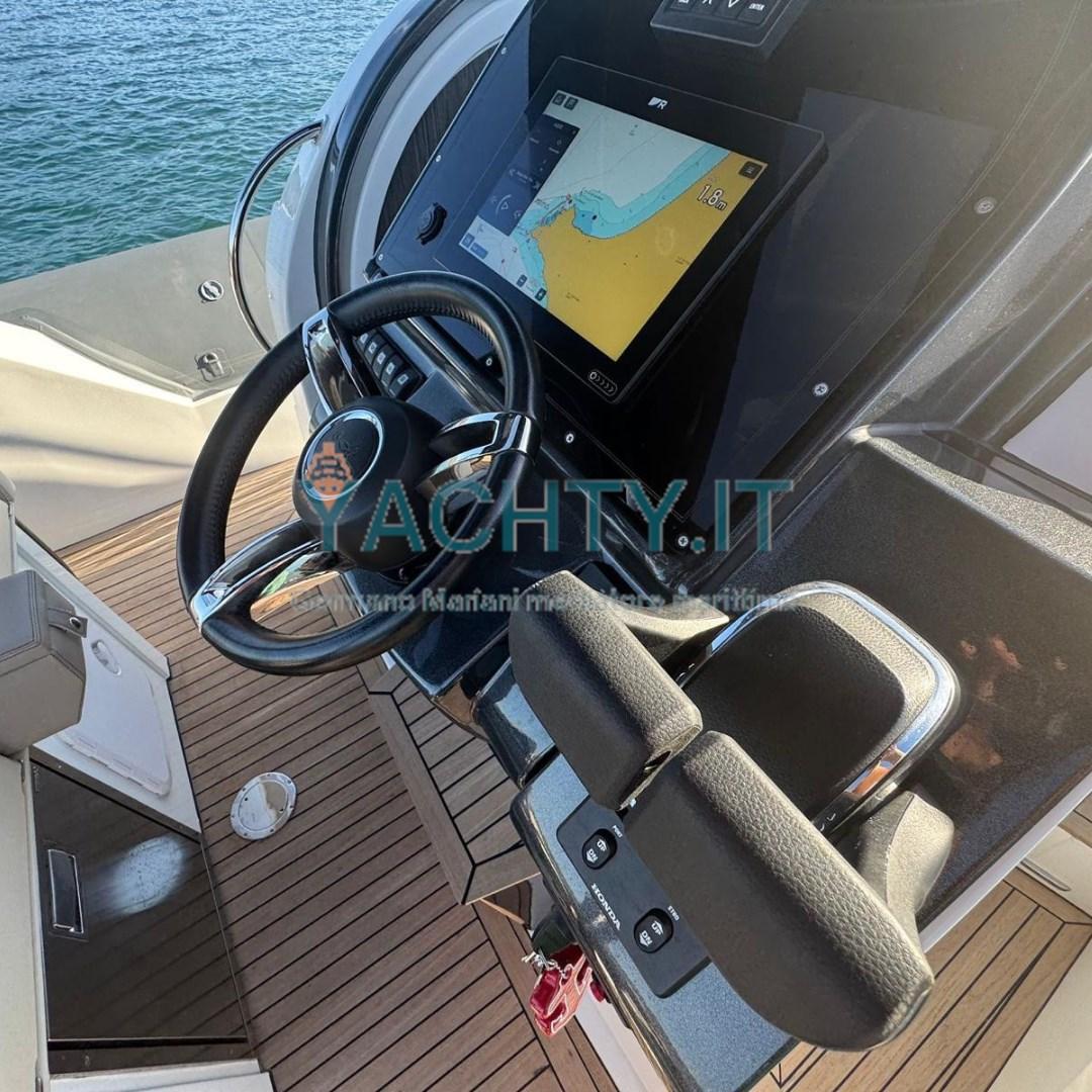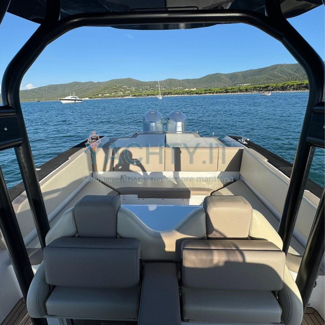 Cette configuration améliore l’expérience à bord avec un T-Top équipé de vitres panoramiques, de direction assistée électrique et de manettes électroniques, tandis que le teck du cockpit contribue à créer une ambiance élégante et accueillante. La présence de la cabine supplémentaire dans la trappe arrière augmente encore la qualité de vie, rendant le bateau idéal même pour les week-ends et les séjours prolongés.