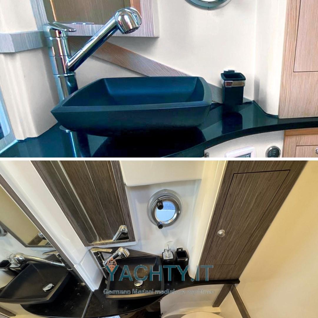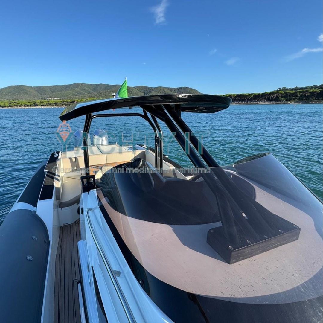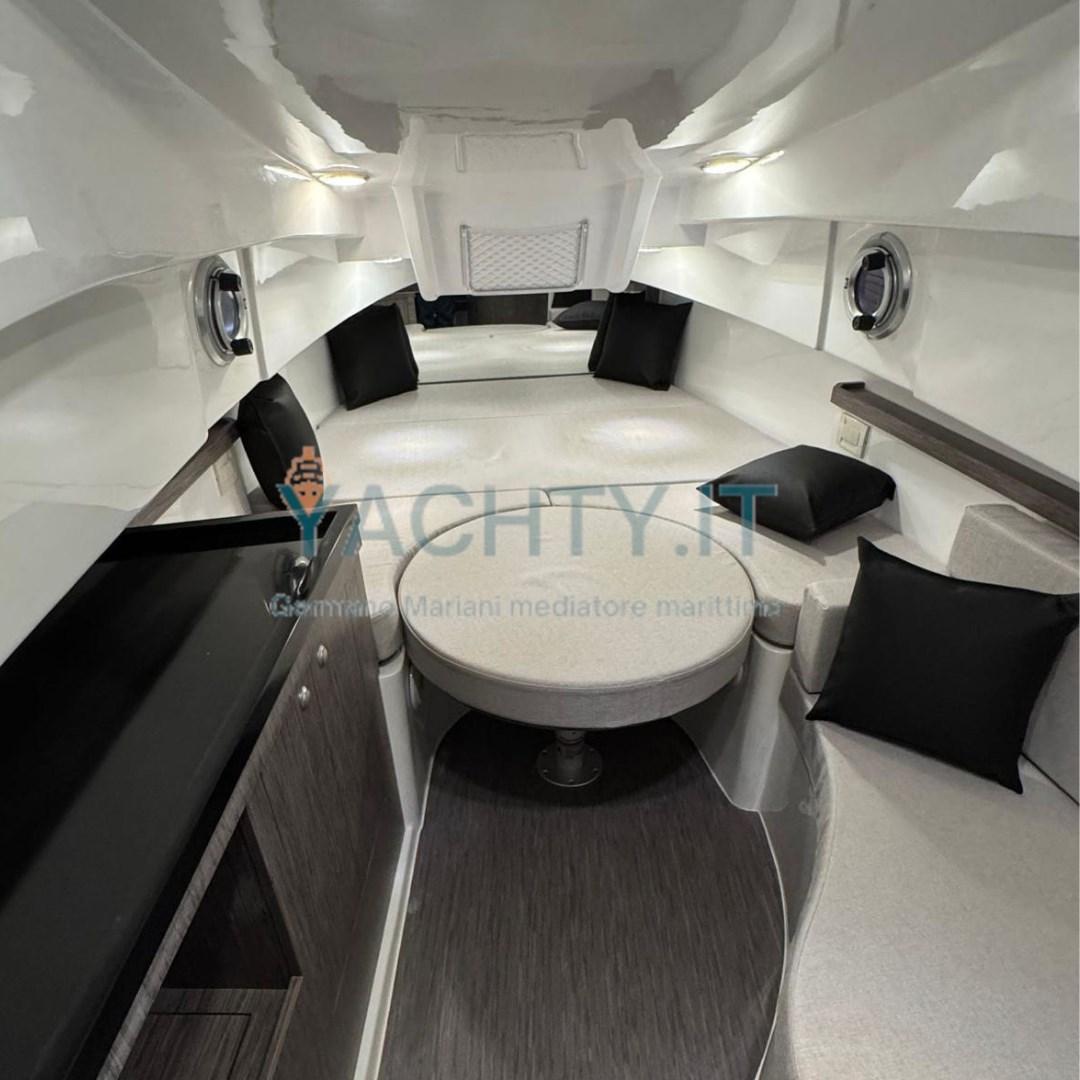 Cette configuration améliore l’expérience à bord avec un T-Top équipé de vitres panoramiques, de direction assistée électrique et de manettes électroniques, tandis que le teck du cockpit contribue à créer une ambiance élégante et accueillante. La présence de la cabine supplémentaire dans la trappe arrière augmente encore la qualité de vie, rendant le bateau idéal même pour les week-ends et les séjours prolongés.