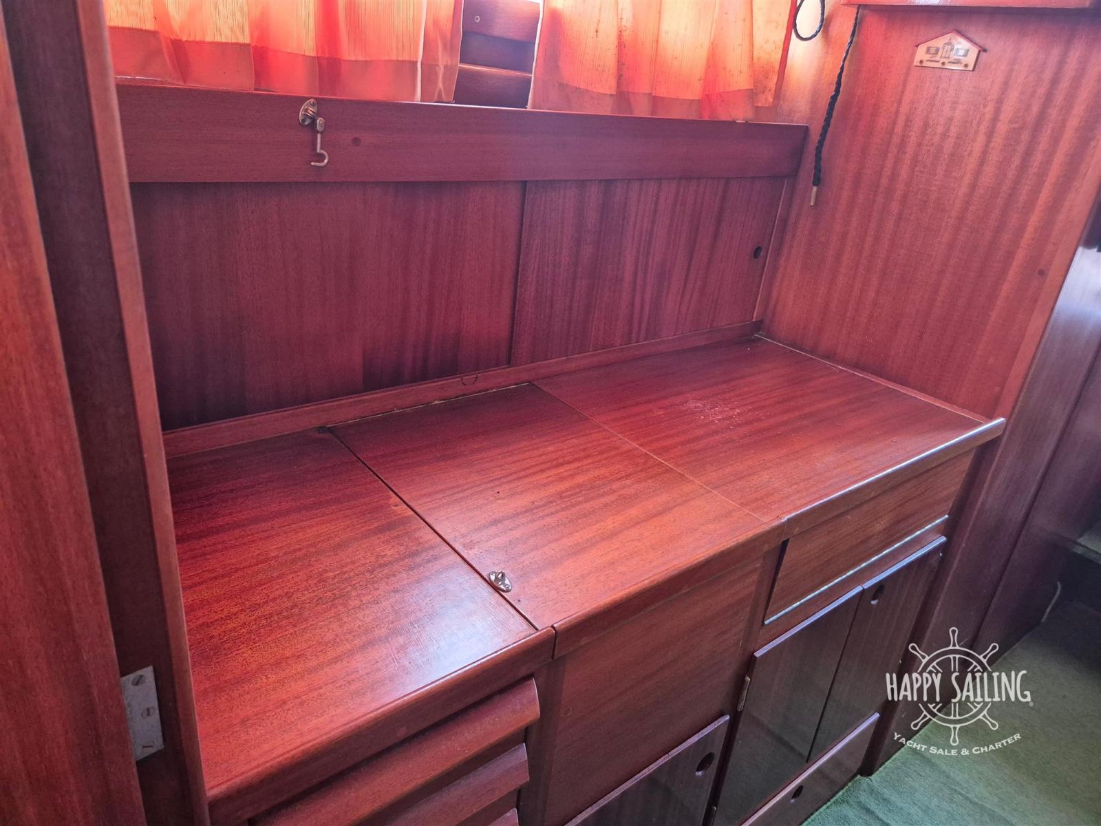 Eau sous pression, Douche de cockpit, Flaps hydrauliques, Bossoirs, Passerelle, Plateforme arrière, Pont en teck, Cockpit en teck, Prise de quai, Onduleur, Guindeau électrique, Echelle de bain.