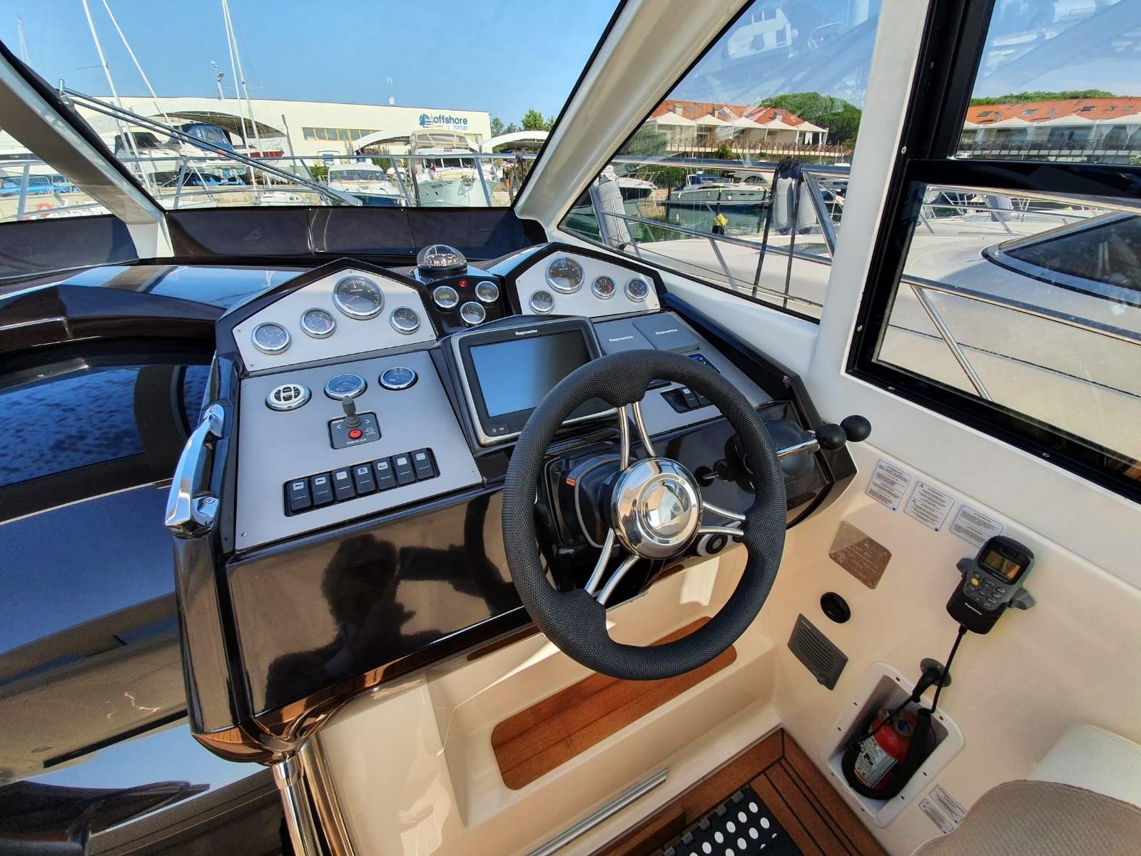 Alarme moteur, Couleur spéciale (Blu Hull), Douche de cockpit, Flaps électriques, Hard top, Extincteur(s) fixe(s), Éclairage de courtoisie, Passerelle, Cockpit en teck, Prise de quai, table de cockpit.