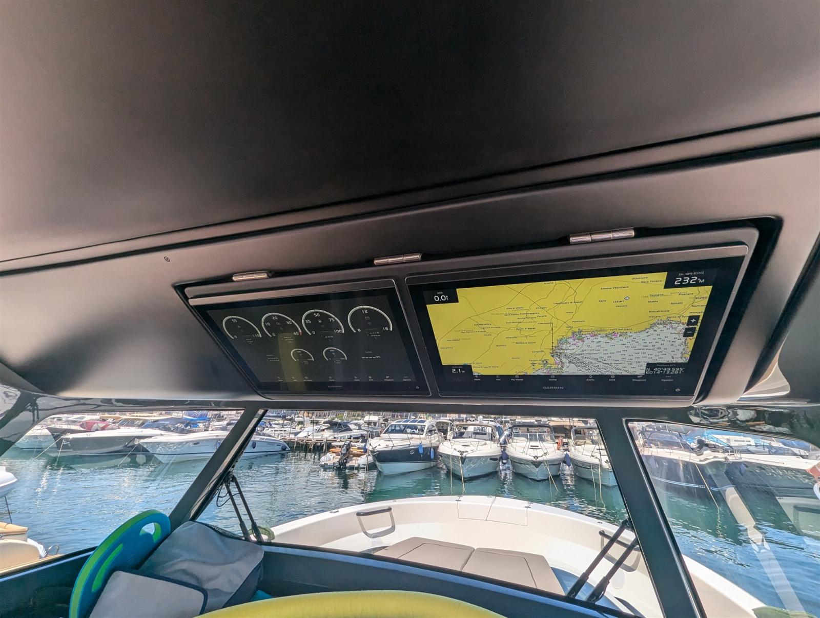 Indicateur d'angle de barre, Antenne radar (Garmin), Commande électrique (Volvo Penta EVC), Ordinateur fixe de bord (Volvo), Compteur de chaîne (digitale), Loch (Garmin), DSC VHF (Garmin), Sondeur pêche (Garmin), GPS (Garmin), Joystick (Volvo Penta), Pilote automatique (Volvo), 2 Lecteur de cartes (Garmin 16"), Radar (Garmin), Siège copilote.
