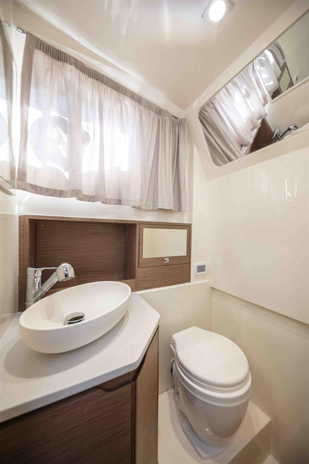 Salle de bain séparée avec lavabo, douche, toilettes nautiques