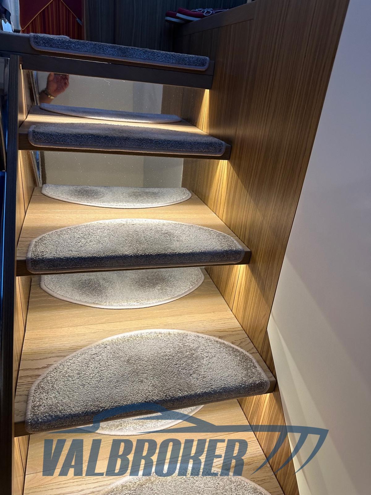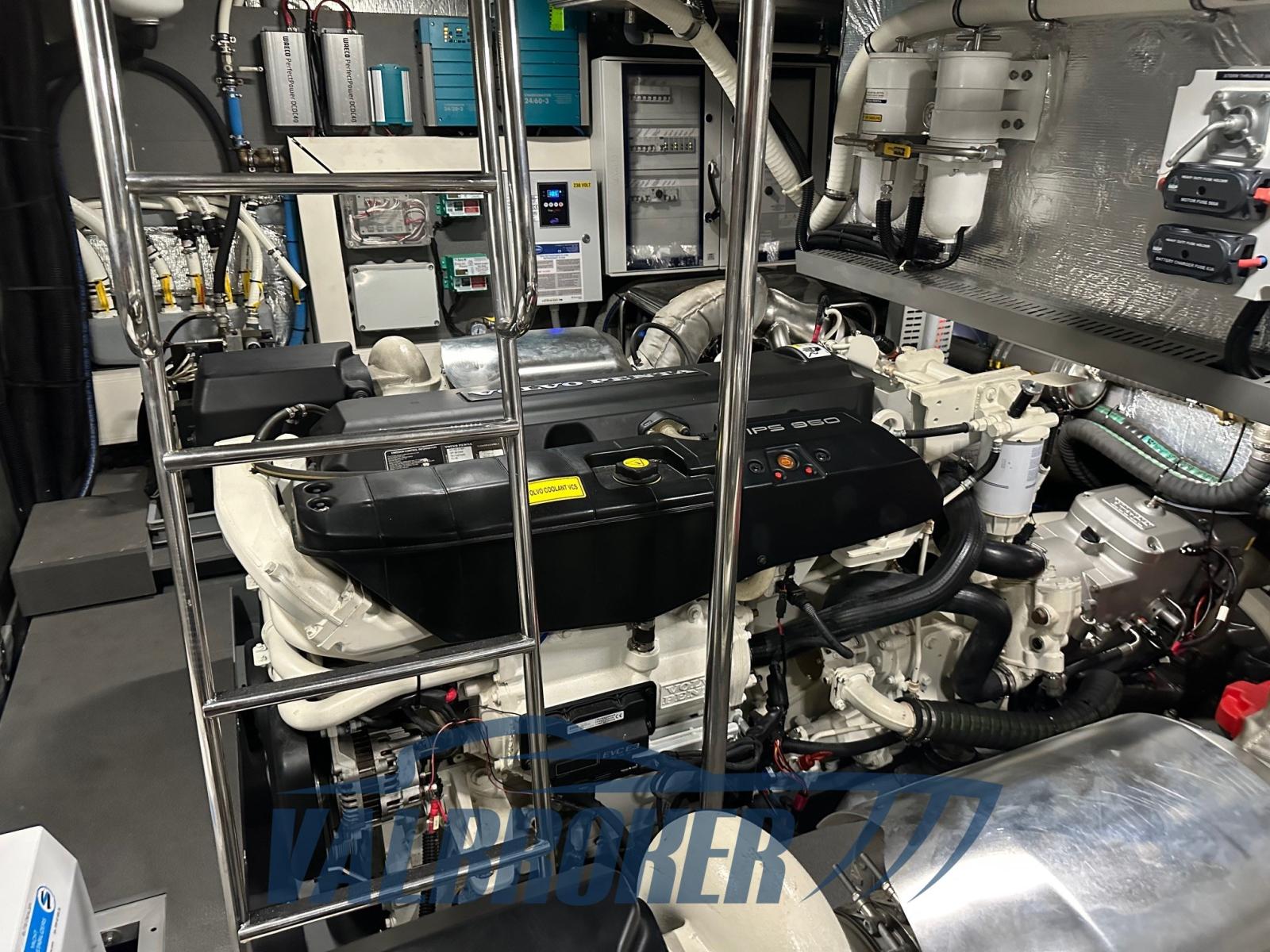 Porte étanche pour un accès direct à la salle des machines depuis la quatrième cabine arrière ou la boîte à gants arrière, marches en teck massif, volets intercepteurs Volvo, troisième poste de contrôle du cockpit
