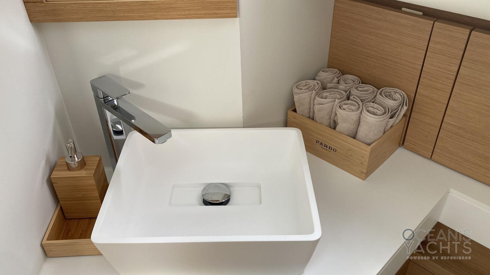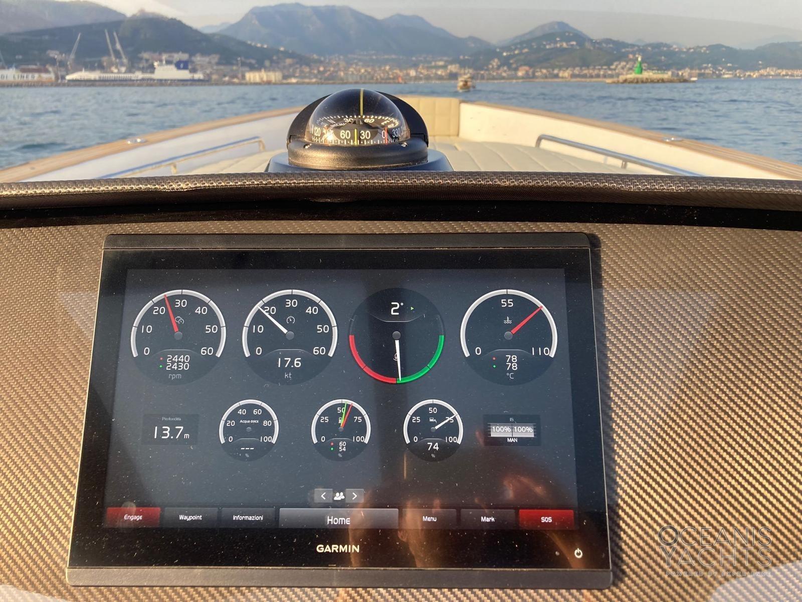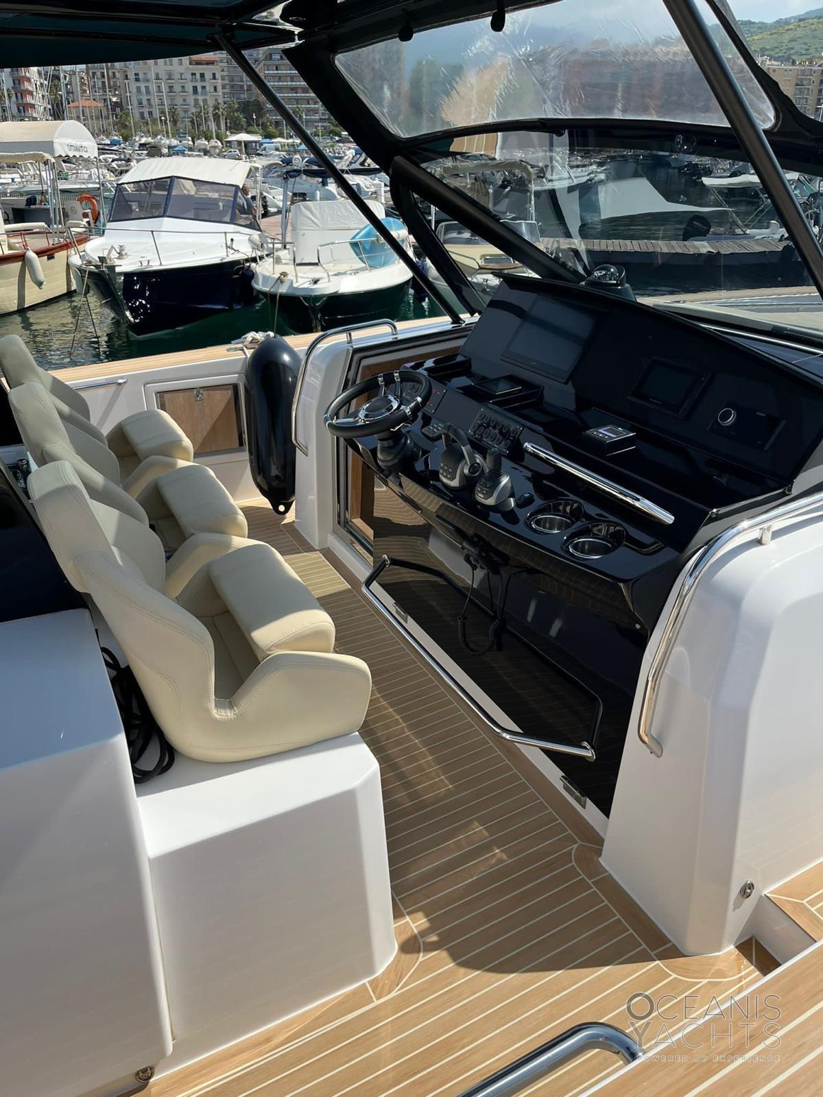 Auto Dynamic Trim Interceptor, Passavant en teck, Douche de cockpit, Garage à annexe, Lavabo dans le cockpit, Éclairage de courtoisie, Spots sous-marins, Défenses, Passerelle, Pont en teck, Cockpit en teck, Prise de quai, Connexion eau sous pression à quai, Echelle de bain, Stabilisateurs, table de cockpit, Filières avec sortie latèrale, Corne, T-Top.