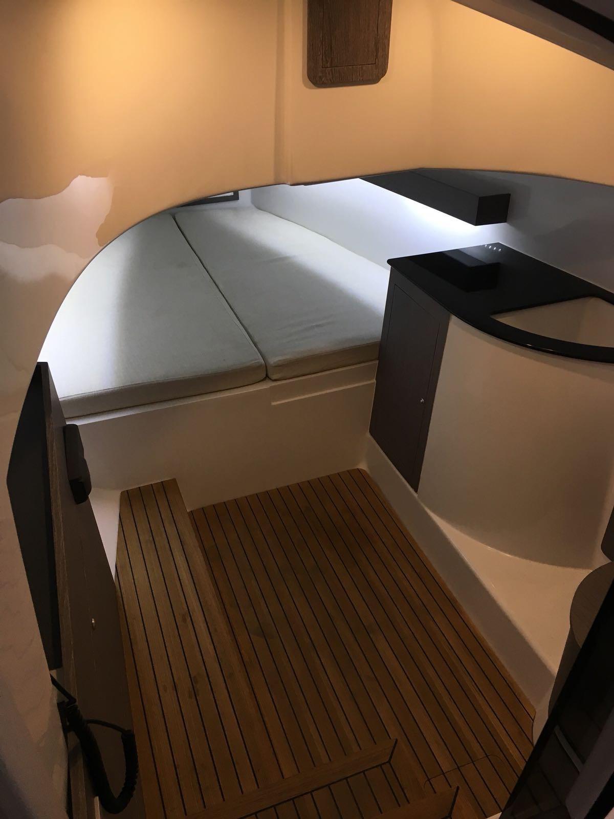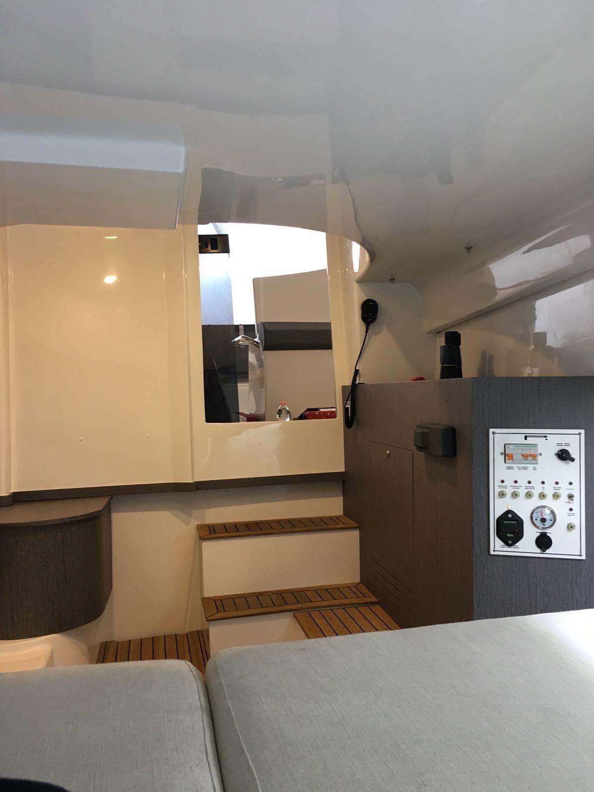 électrique, autoclave avec douche, plateforme arrière et passerelles avant recouvertes de teck. Description intérieure de la cabine avec lit double, un