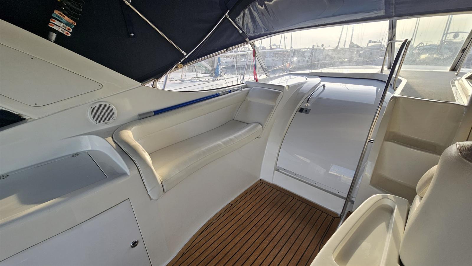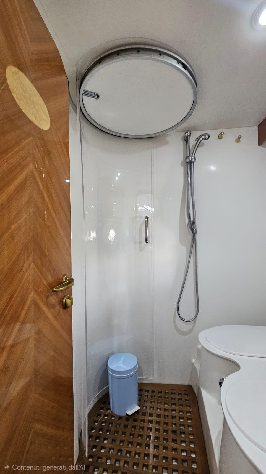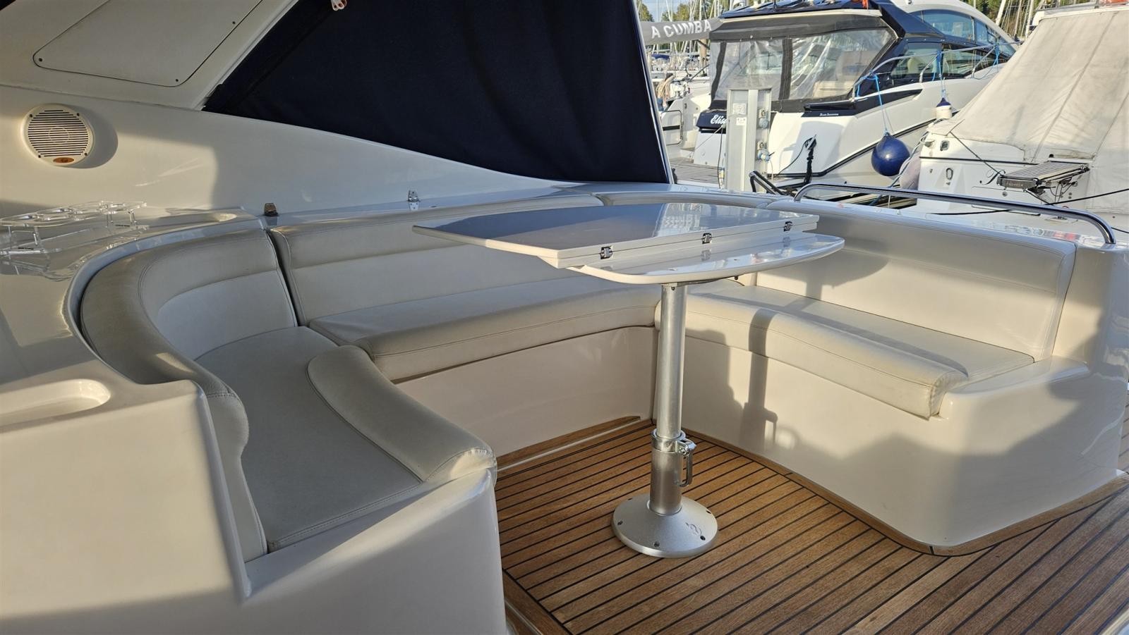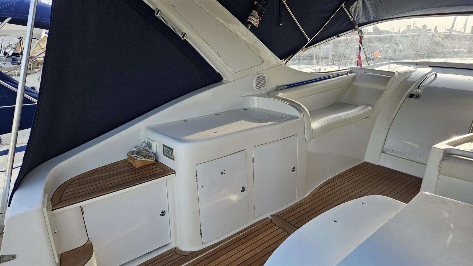 Douche de cockpit, Propulseur d'étrave (Vetus), Phare de poursuite, Flaps hydrauliques (N°2), Lavabo dans le cockpit, Passerelle (Idraulica), Plateforme arrière (di poppa con fondo in teak), Cockpit en teck, Connexion eau sous pression à quai, Rollbar, Guindeau électrique, table de cockpit.