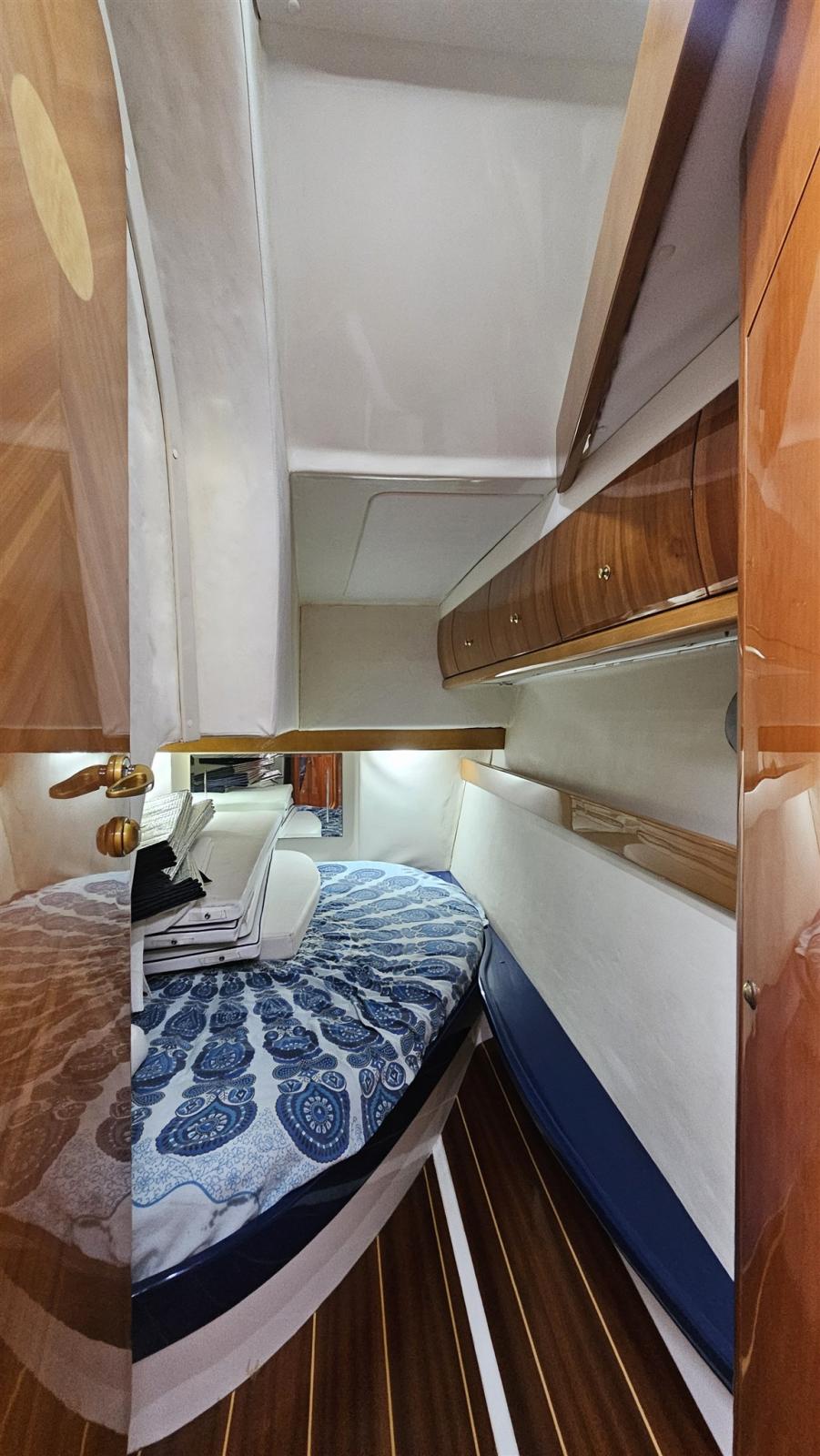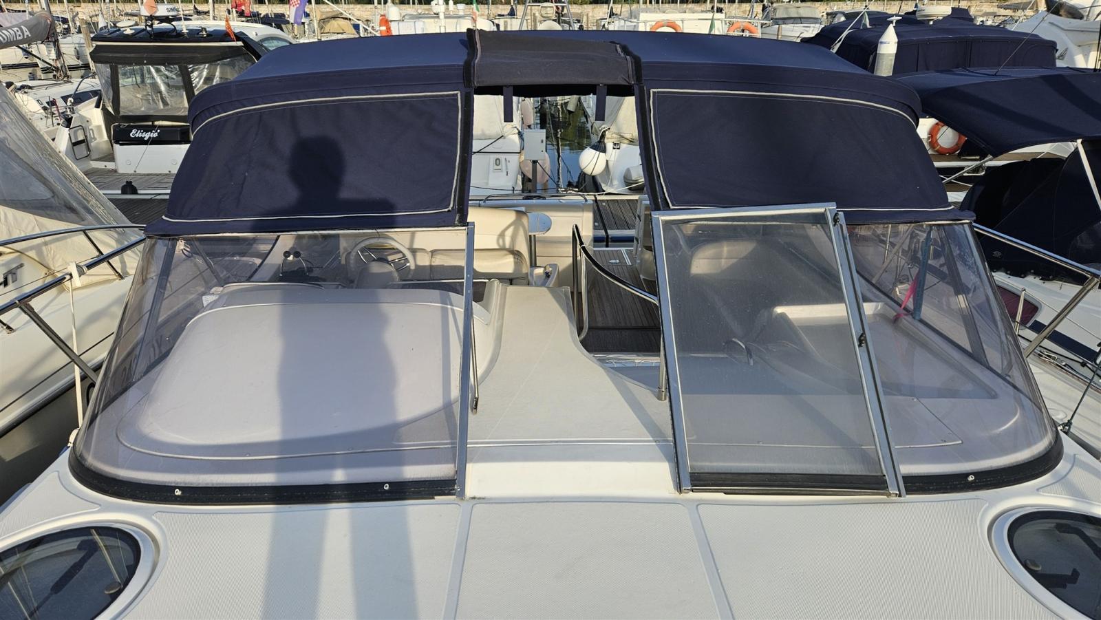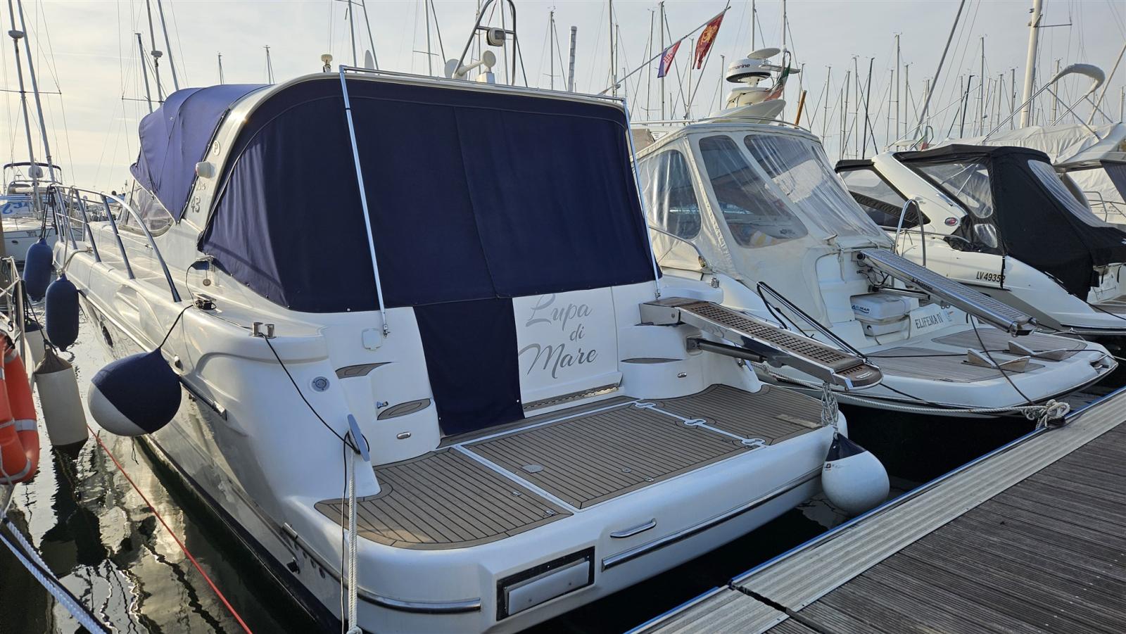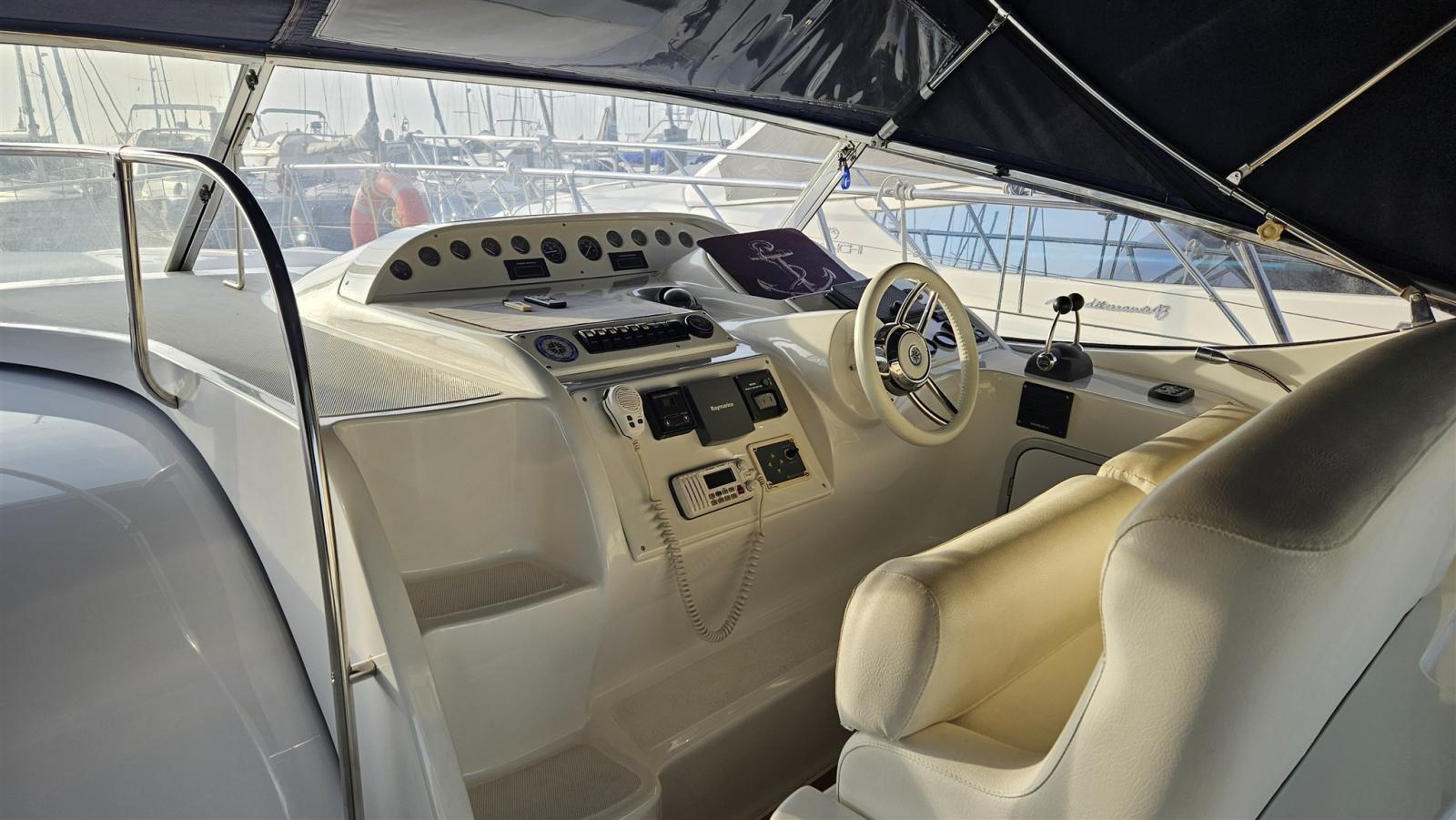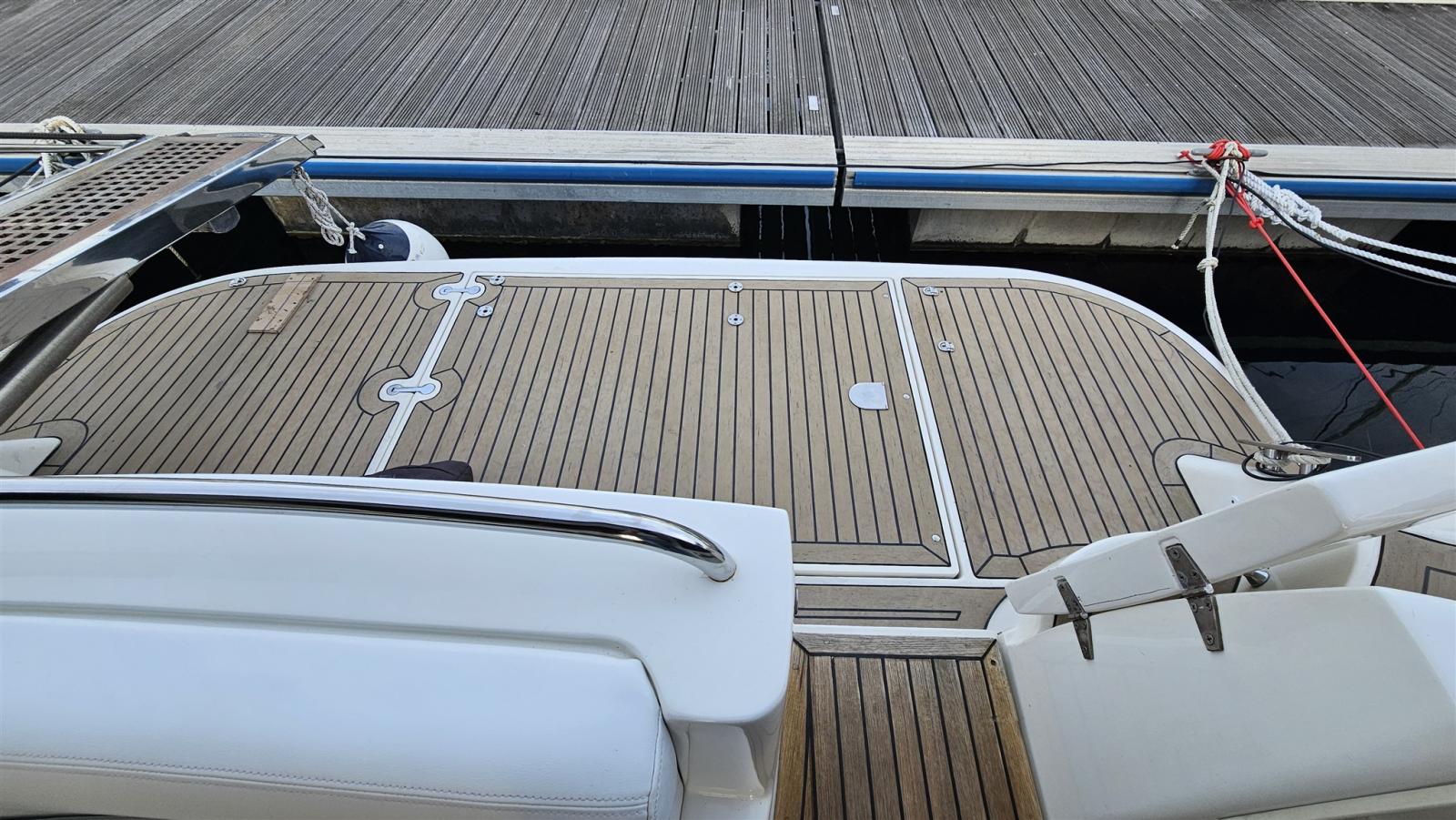 Douche de cockpit, Propulseur d'étrave (Vetus), Phare de poursuite, Flaps hydrauliques (N°2), Lavabo dans le cockpit, Passerelle (Idraulica), Plateforme arrière (di poppa con fondo in teak), Cockpit en teck, Connexion eau sous pression à quai, Rollbar, Guindeau électrique, table de cockpit.