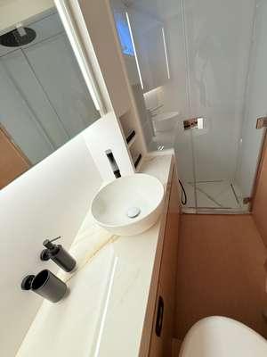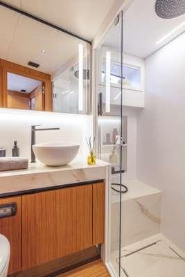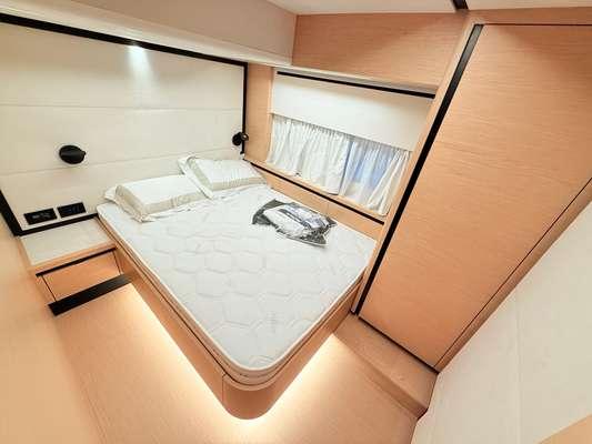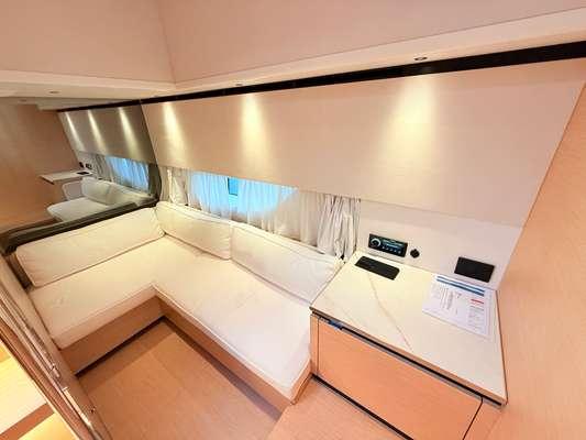 **TOUT LE CONFORT POUR UNE QUALITÉ DE VIE À BORD ENVIABLE** La cabine principale offre un espace et un confort impressionnants, avec un lit dont la taille rivalise avec ceux que l’on trouve habituellement sur des yachts beaucoup plus grands.