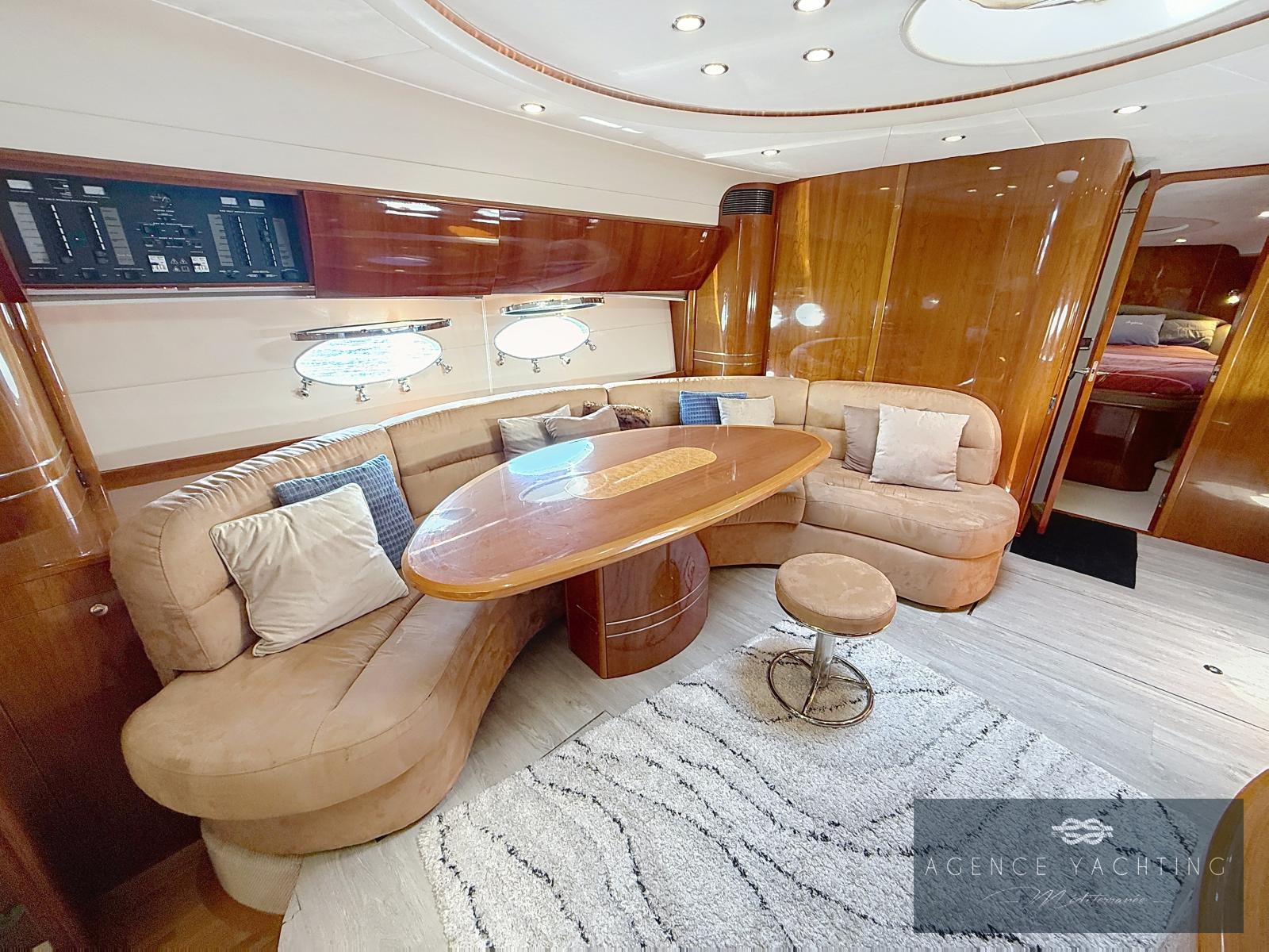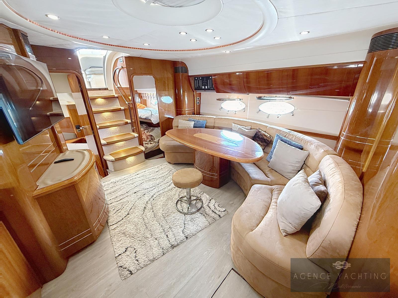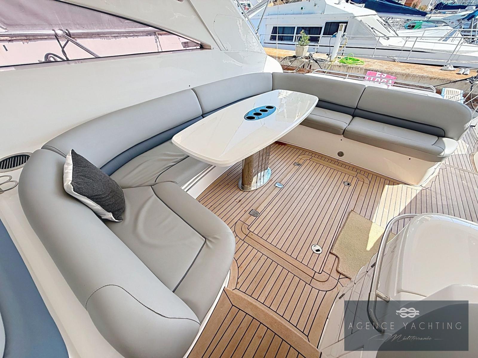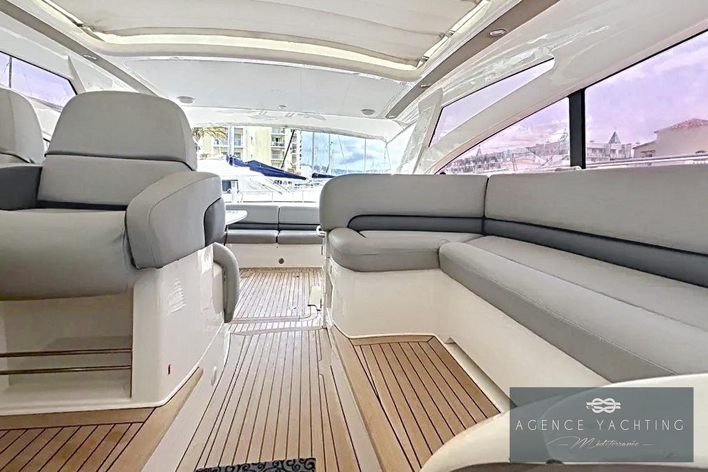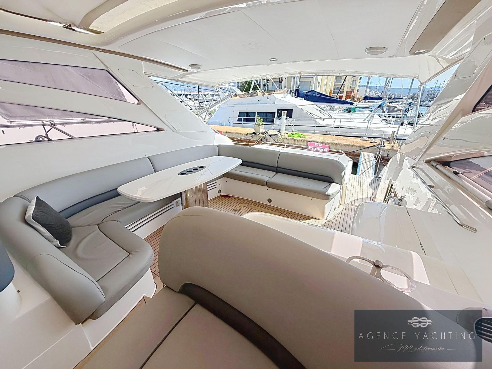Dès l’embarquement, le yacht séduit par la fluidité de ses circulations et par la générosité de ses espaces extérieurs. La passerelle hydraulique intégrée facilite l’accès depuis le quai, tandis que la plage de bain, élégamment dessinée, ouvre sur un vaste garage à annexe surmonté d’un large bain de soleil, véritable invitation à la détente au mouillage. Le cockpit, particulièrement spacieux, est conçu comme un véritable salon extérieur : coin cuisine parfaitement intégré, grande table conviviale et selleries en parfait état créent une atmosphère à la fois raffinée et chaleureuse. Le poste de pilotage, abrité sous le hard-top, bénéficie d’une ergonomie exemplaire et d’une électronique moderne avec traceur Garmin tactile récent, garantissant une navigation précise et sereine.