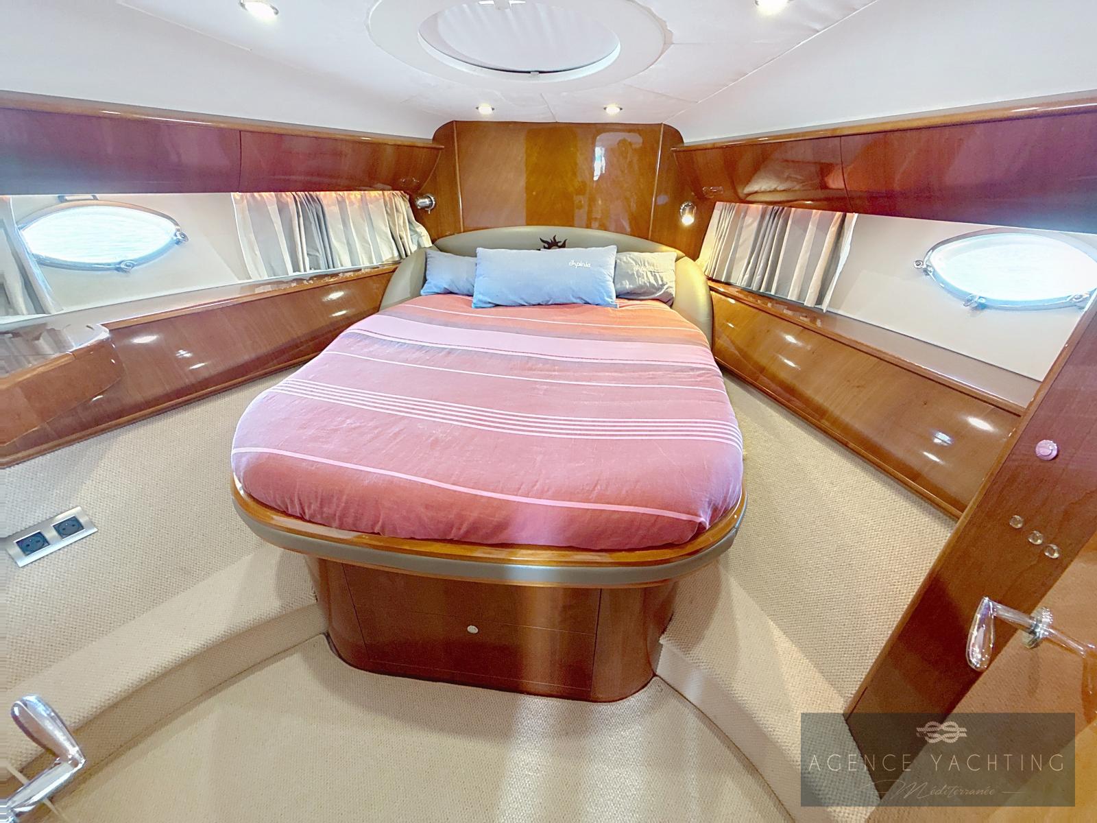 À l’intérieur, l’ambiance est résolument yacht de standing. Le carré, baigné de lumière, offre un volume remarquable pour cette catégorie, avec une cuisine élégamment positionnée sur tribord. L’espace nuit se compose de trois véritables cabines, pensées pour le confort en croisière : une cabine propriétaire spacieuse à l’avant avec salle d’eau privative, une grande cabine double sur tribord disposant également de sa salle d’eau, et une cabine arrière bâbord offrant un couchage double complété par un lit simple. L’ensemble est entièrement climatisé (Réversible), y compris sous le hard-top, garantissant un confort optimal en toutes saisons.