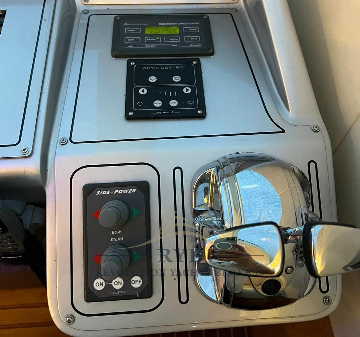 Alarme moteur, Alarme de pompe de cale, Eau sous pression, Douche de cockpit, Double barre à roue, Flaps hydrauliques, Extincteur(s) fixe(s), Passerelle, Plateforme arrière, Pompe de cale automatique, Porte latérale, Cockpit en teck, Prise de quai, Rollbar, Guindeau électrique, Selles pour Annexe, table de cockpit, Annexe, Winch électrique arrière.