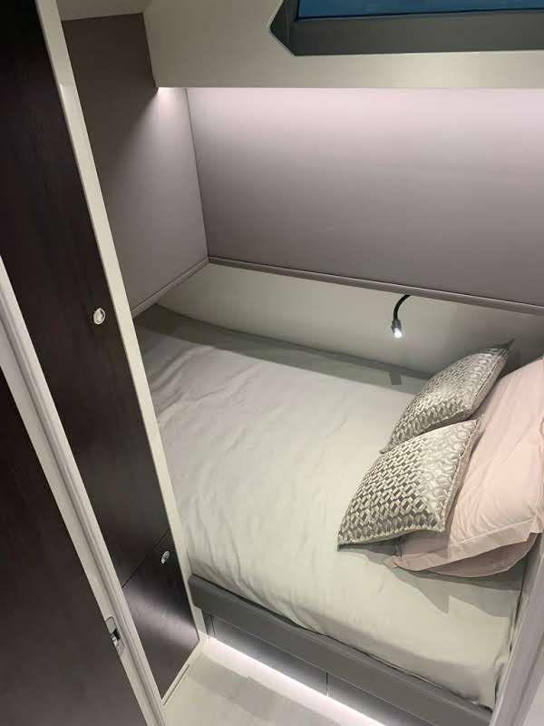 À l'intérieur, deux cabines et une salle de bain offrent confort et intimité, tandis que des finitions de haute qualité créent une atmosphère luxueuse. De grandes fenêtres apportent une lumière naturelle abondante à l'intérieur, rendant chaque moment à bord lumineux et accueillant.