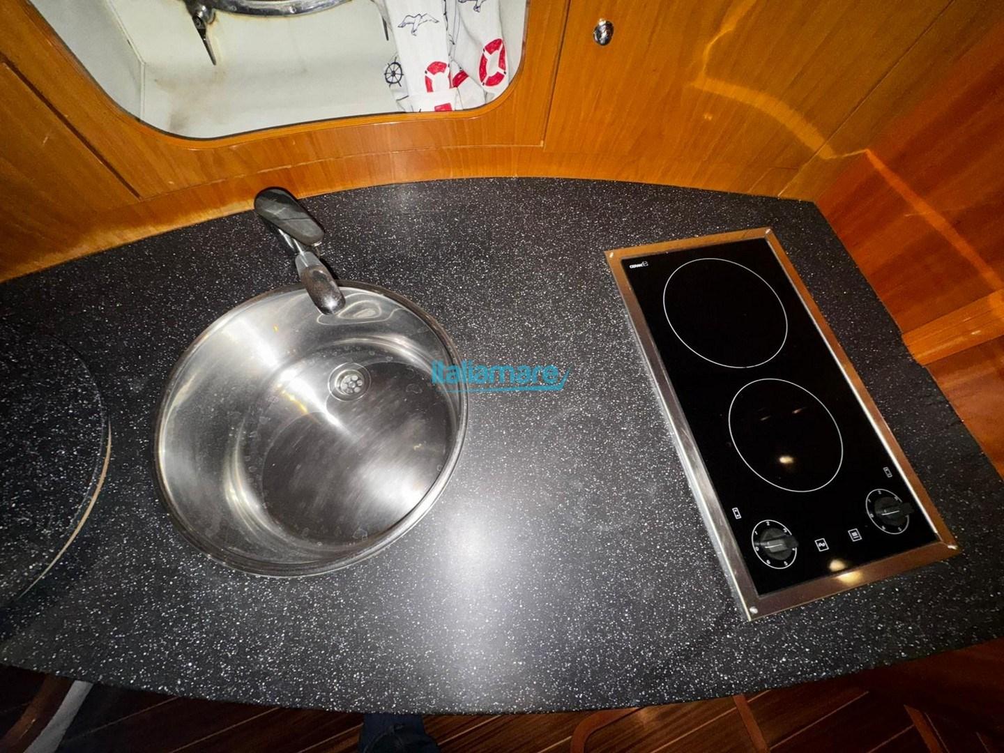 Sous le pont, elle propose trois cabines séparées et deux couches, conservant une grande hauteur de tête sur toute la surface et une dinette lumineuse généralement revêtue en bois de cerisier classique.