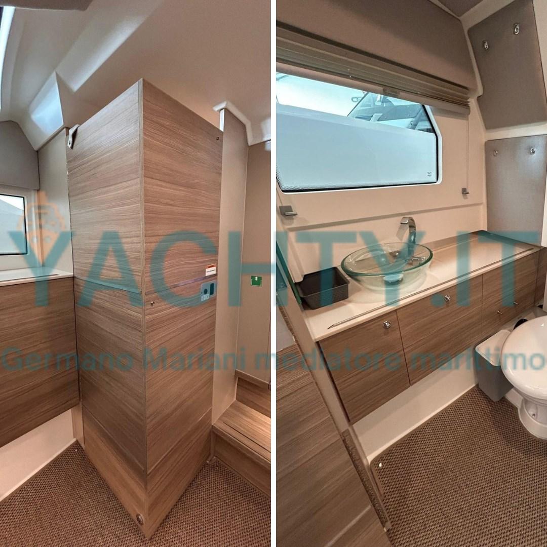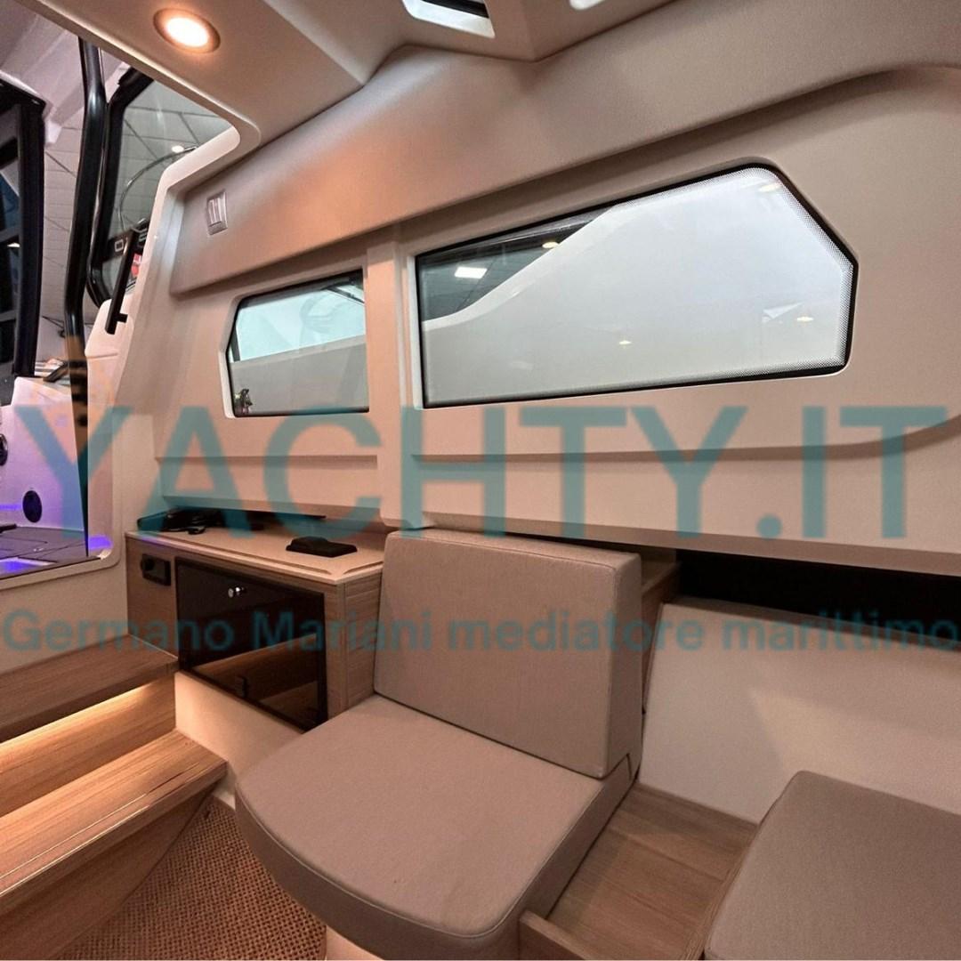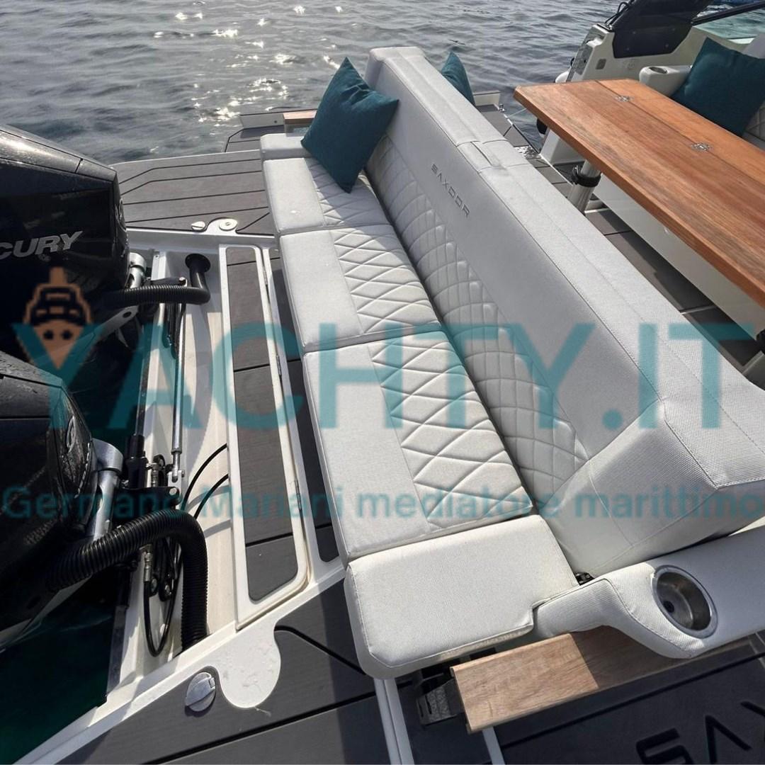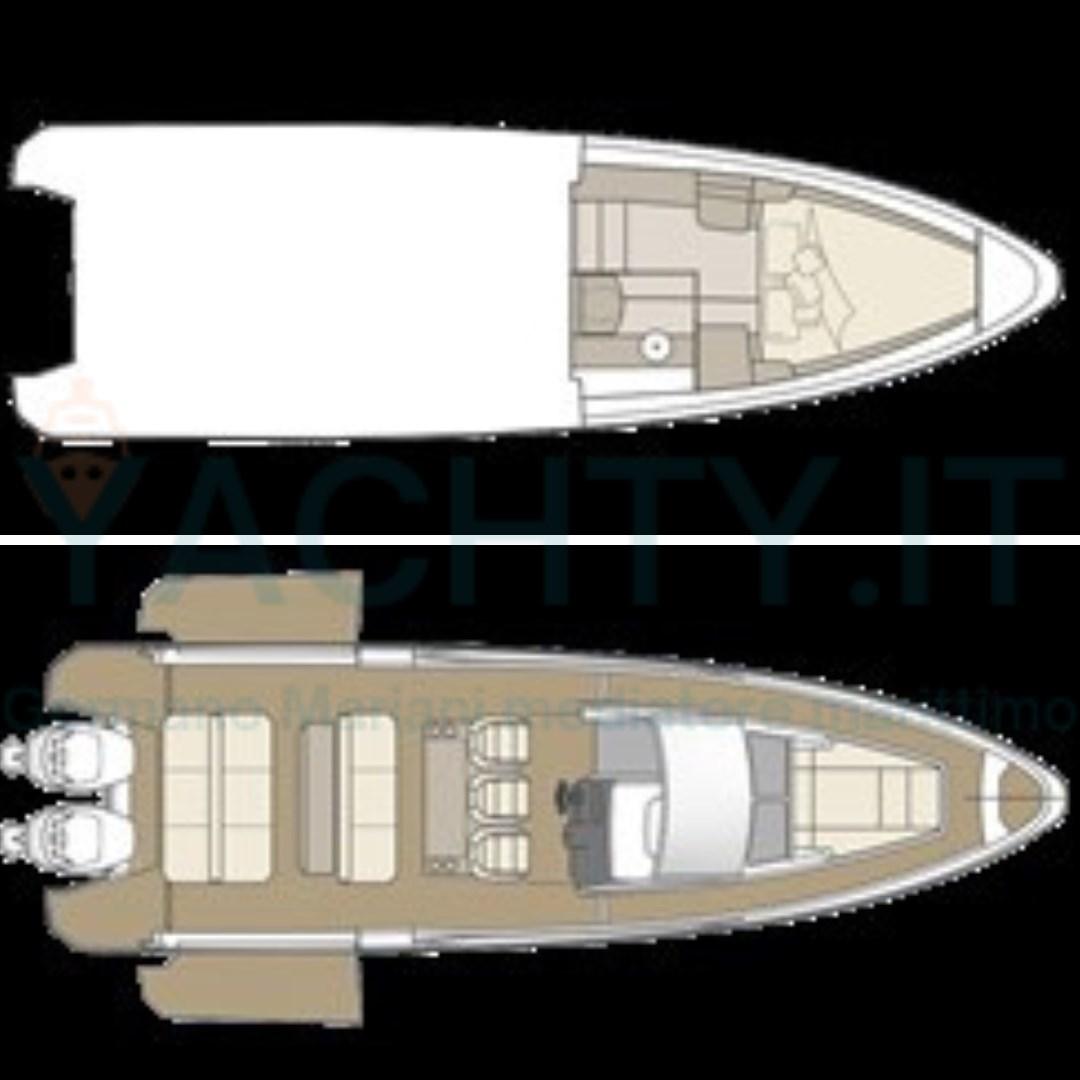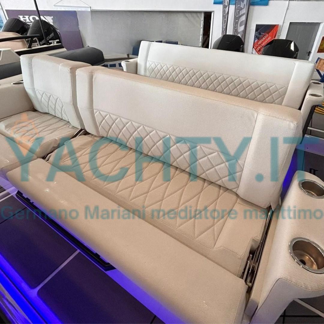 Bimini (tendalino con pali in carbonio a poppa), Sellerie complète, Coussins arrieres (divani trasformabili in prendisole a poppa), Coussin avant, sellerie de cockpit, Matelas.