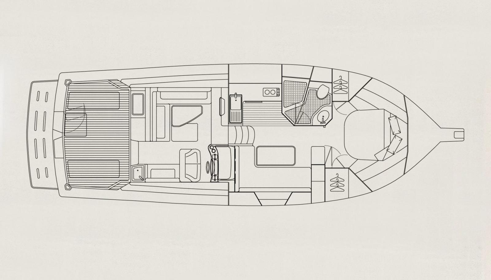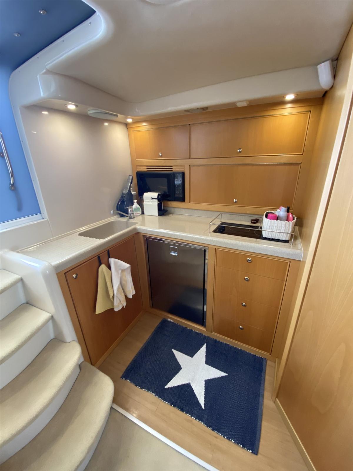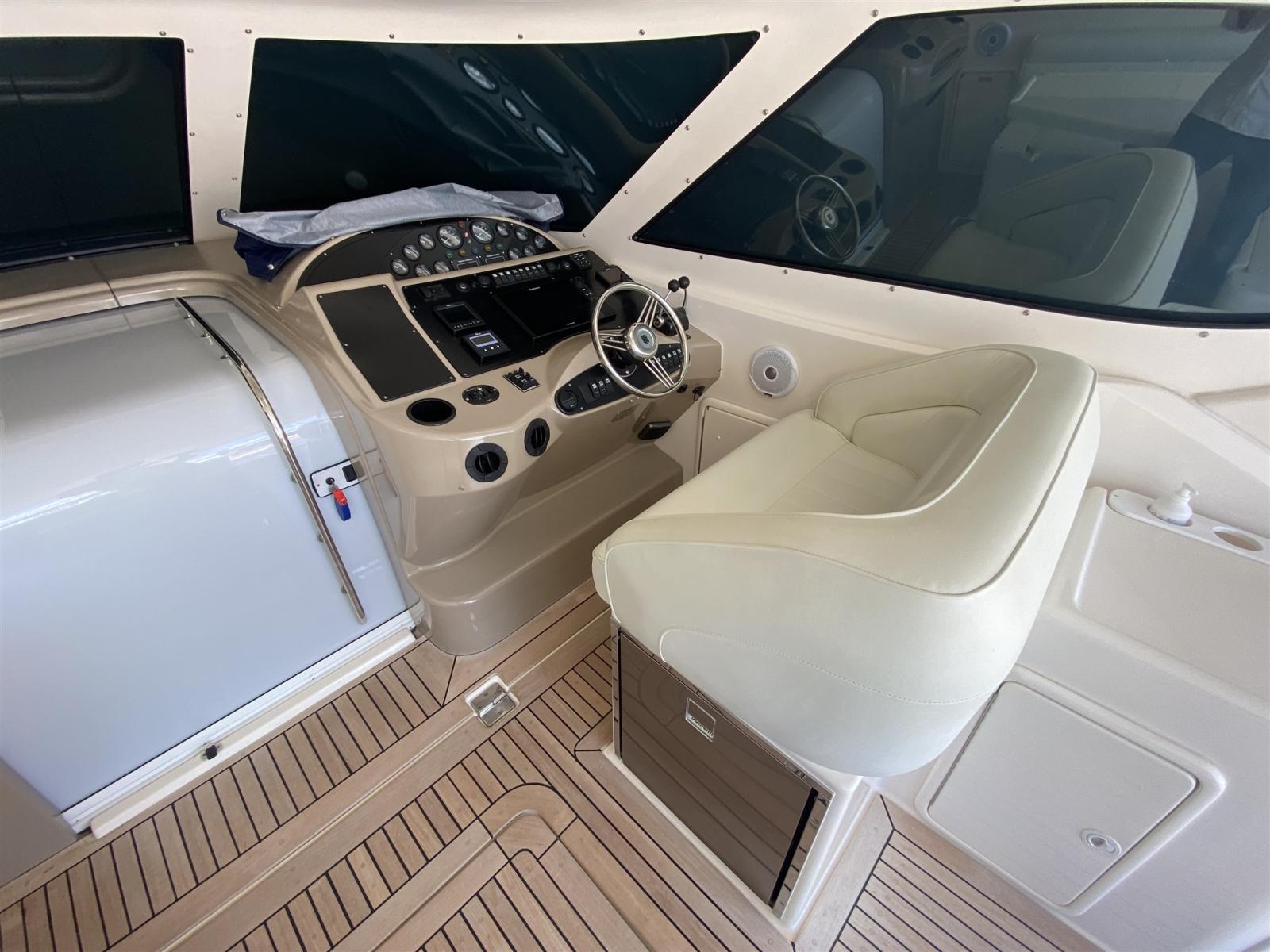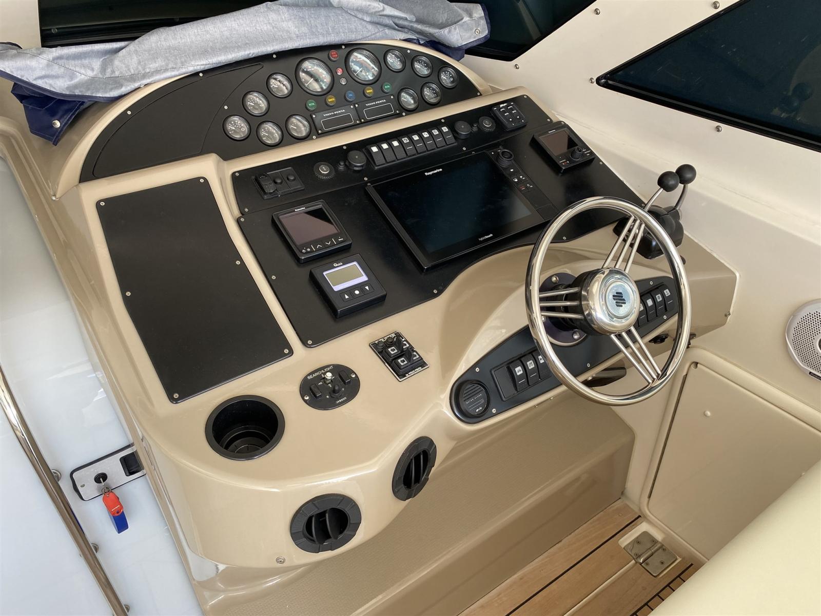 Alarme gaz, Alarme moteur, Alarme de pompe de cale, Ouverture du compartiment moteur électrique, Eau sous pression, Douche de cockpit, Phare de poursuite, Flaps électriques, Hard top, Extincteur(s) fixe(s), Éclairage de courtoisie, Passerelle, Plateforme arrière, Pompe de cale automatique, Pompe de cale manuelle, Porte latérale, Cockpit en teck, Prise de quai, Guindeau électrique, Echelle de bain, table de cockpit, Corne, Winch électrique arrière.