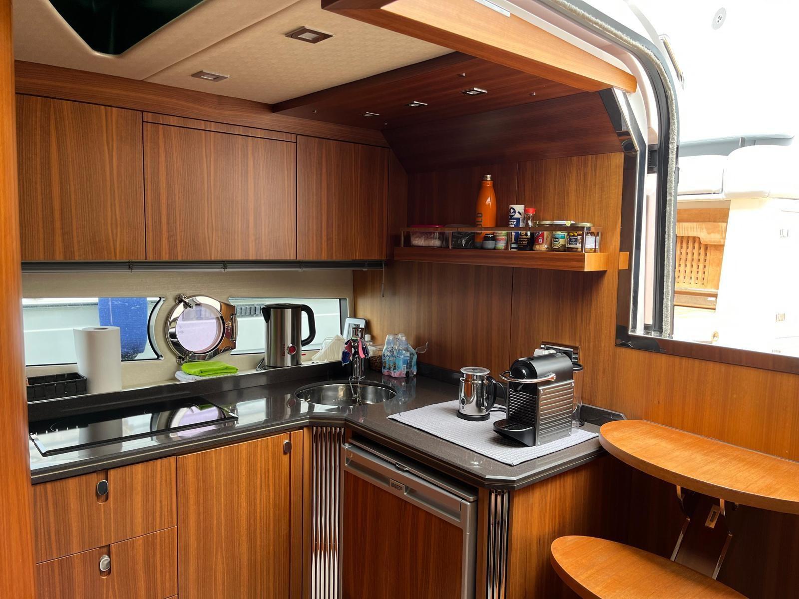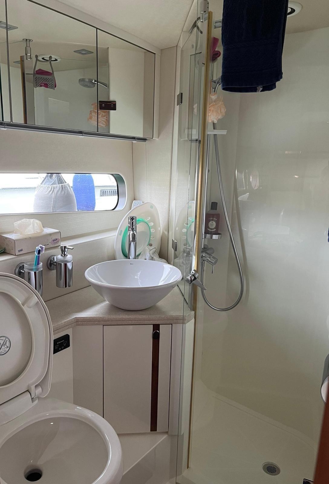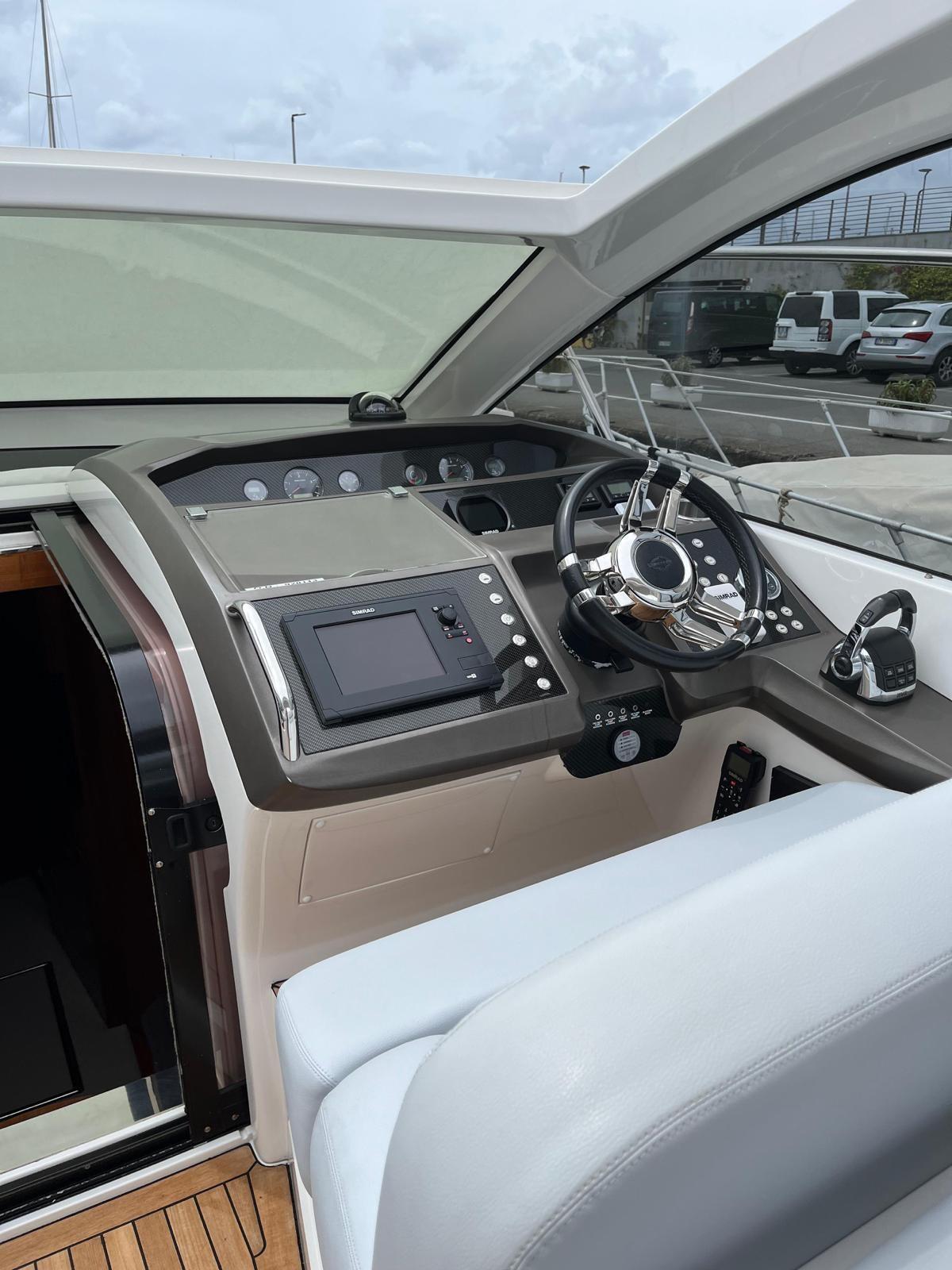 Alarme moteur, Alarme de pompe de cale, Alternateur, Ouverture du compartiment moteur électrique, Eau sous pression, Douche de cockpit, Flaps électriques, Hard top, Extincteur(s) fixe(s), Lavabo dans le cockpit, Éclairage de courtoisie, Spots sous-marins, Plateforme arrière, Pompe de cale automatique, Pompe de cale manuelle, Porte latérale, Cockpit en teck, Prise de quai, Guindeau électrique, Echelle de bain, table de cockpit, Table pliante de salon, Filières avec sortie latèrale, Corne.