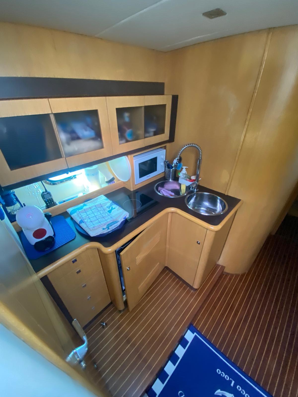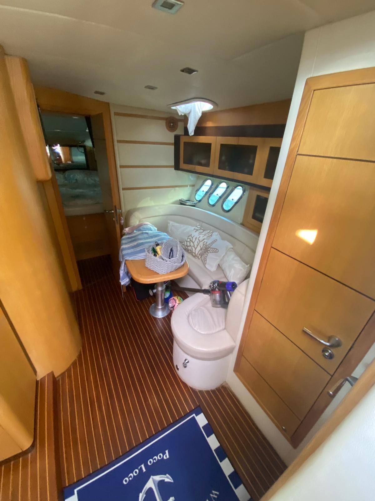 Alarme moteur, Alarme de pompe de cale, Ouverture du compartiment moteur électrique, Eau sous pression, Douche de cockpit, Phare de poursuite, Flaps hydrauliques, Hard top, Extincteur(s) fixe(s), Indicateurs de flaps, Lavabo dans le cockpit, Éclairage de courtoisie, Spots sous-marins, Plateforme arrière, Pompe de cale manuelle, Cockpit en teck, Prise de quai, Connexion eau sous pression à quai, Guindeau électrique, Echelle de bain, table de cockpit, Table pliante de salon, Annexe, Corne.
