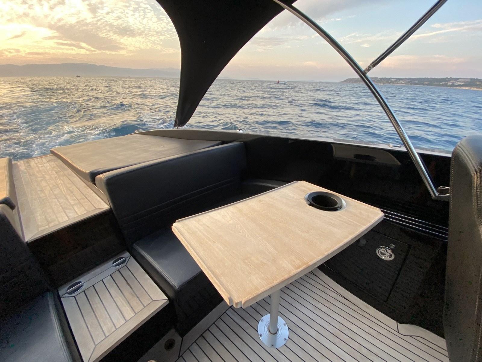 Alarme moteur, Alarme de pompe de cale, Eau sous pression, Flaps électriques, Cockpit en teck, Prise de quai, Guindeau électrique, table de cockpit, Pont en teck.