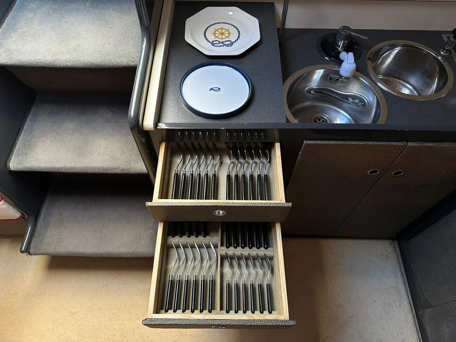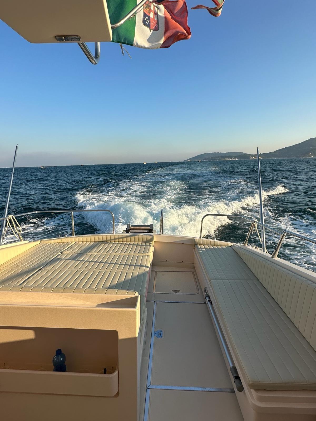Alarme moteur, Alarme de pompe de cale, Eau sous pression, Couleur spéciale (SCAFO ROSSO), Douche de cockpit, Phare de poursuite, Flaps électriques, Lavage de chaine, Lavabo dans le cockpit, Éclairage de courtoisie, Passerelle, Plateforme arrière, Pompe de cale automatique, Pompe de cale manuelle, Porte latérale, Prise de quai, Onduleur, Rollbar, Guindeau électrique, Echelle de bain, table de cockpit, Corne.