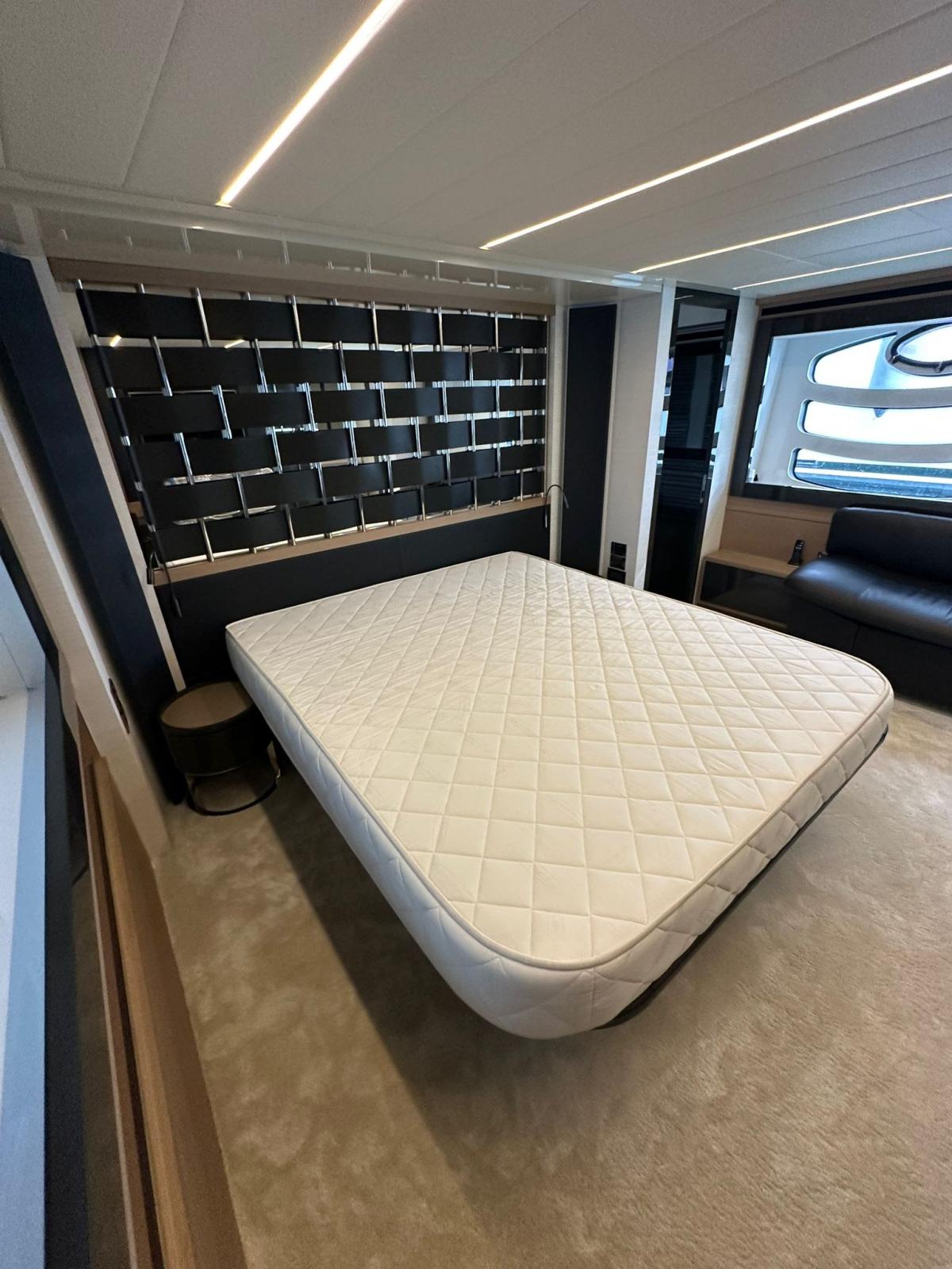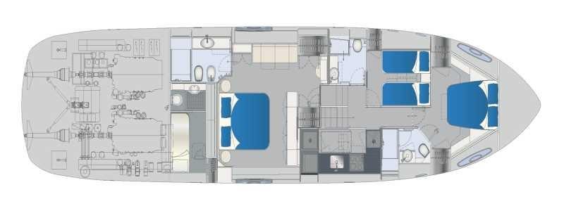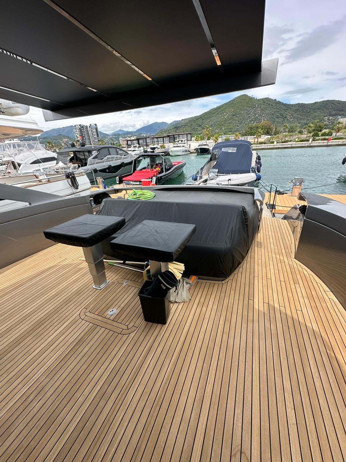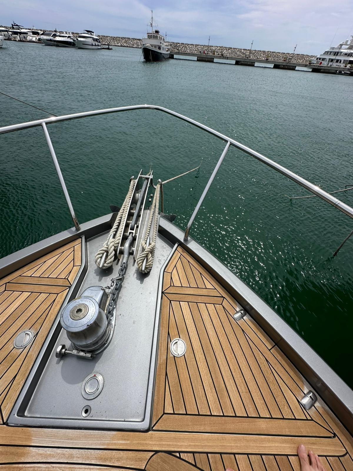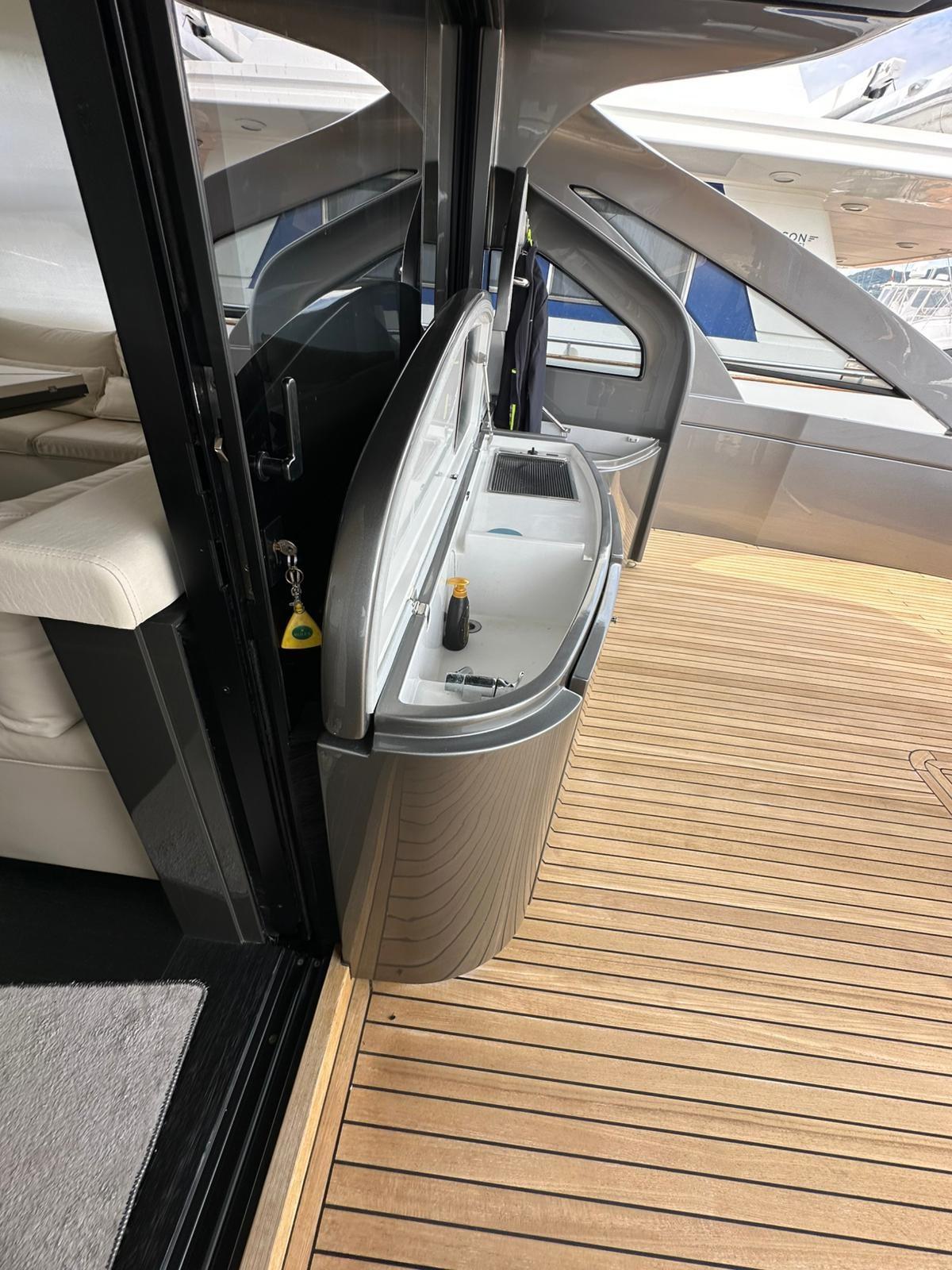 Alarme moteur, Alarme de pompe de cale, Alternateur, Eau sous pression, Taquets pliants, Passavant en teck, Douche de cockpit, Phare de poursuite, Flaps hydrauliques, Garage à annexe, Hard top, Extincteur(s) fixe(s), Indicateurs de flaps, Lavage de chaine, Lavabo dans le cockpit, Éclairage de courtoisie, Spots sous-marins, Passerelle, Plateforme arrière, Pompe de cale automatique, Pompe de cale manuelle, Pont en teck, Porte latérale, Cockpit en teck, Prise de quai, Guindeau électrique, Echelle de bain, Stabilisateurs, table de cockpit, Corne, 2 Winch électrique arrière.