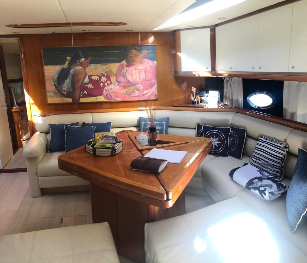 Alarme de pompe de cale, Eau sous pression, Passavant en teck, Couleur spéciale, Douche de cockpit, Phare de poursuite, Flaps hydrauliques, Hard top, Extincteur(s) fixe(s), Spots sous-marins, Plateforme arrière, Pompe de cale automatique, Cockpit en teck, Prise de quai, Guindeau électrique, Echelle de bain, table de cockpit, Winch électrique arrière.