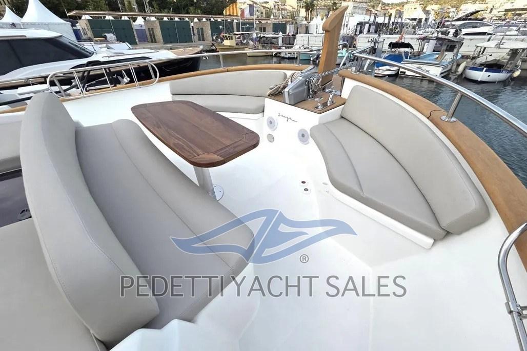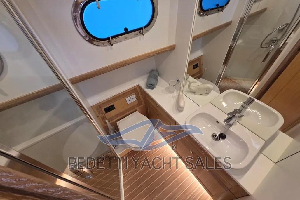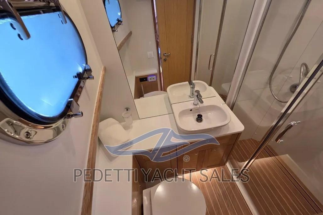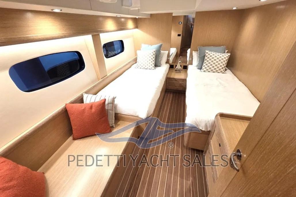 Alarme moteur, Alarme de pompe de cale, Eau sous pression, 10 Batteries (4 motori (95Ah), 6 servizi (100Ah)), Câble d’alimentation à quai, Filères, Double barre à roue, 2 Flaps électriques (Zipwake), Extincteur(s) fixe(s) (sala macchine), Éclairage de courtoisie, Moniteur de batterie, 6 Défenses, Passerelle (idraulica a scomparsa), Plateforme arrière (idraulica), Pompe de Vidange du Réservoir d’Eaux Usées, 3 Pompe de cale électrique, Porte latérale (teak), Cockpit en teck, Prise de quai, Connexion eau sous pression à quai, Répétiteur électronique, Guindeau électrique, Echelle de bain, table de cockpit.