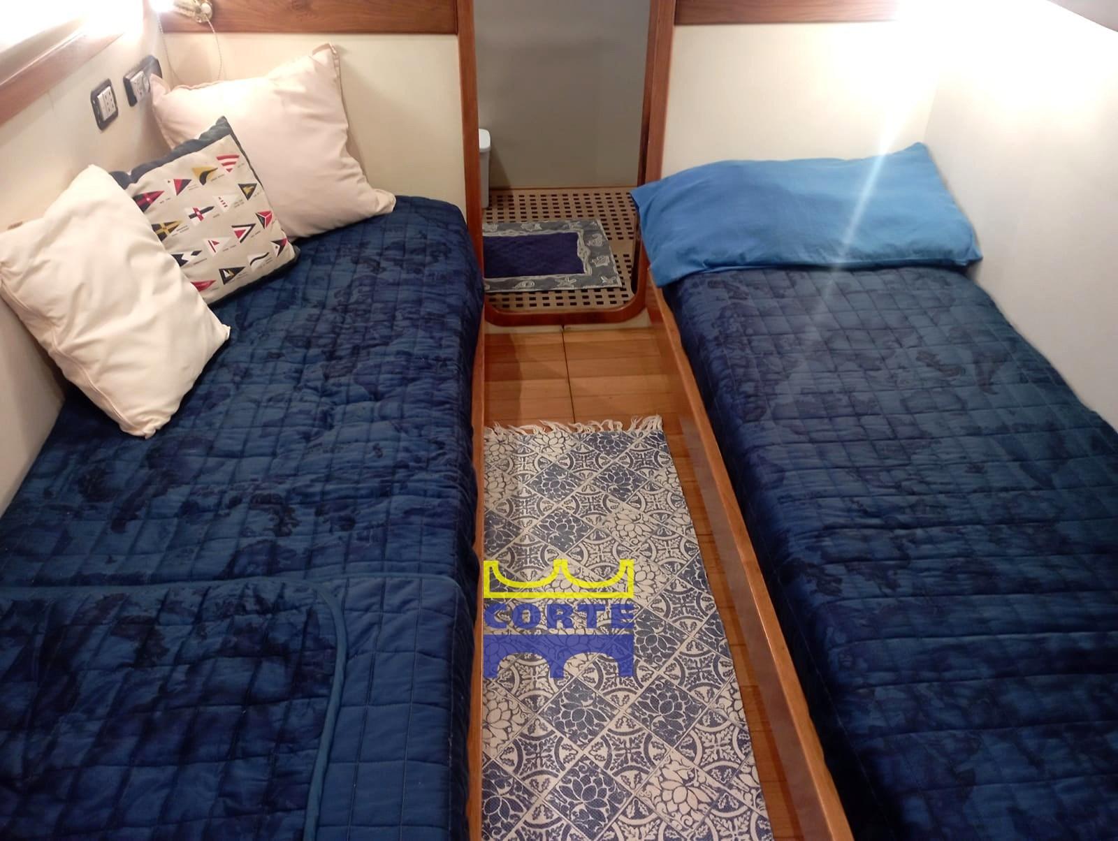 Cabine d’amis tribord avec deux lits côte à côte et salle de bain privée,