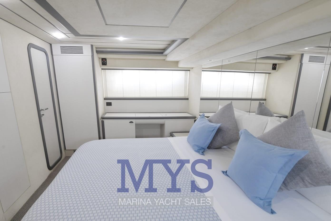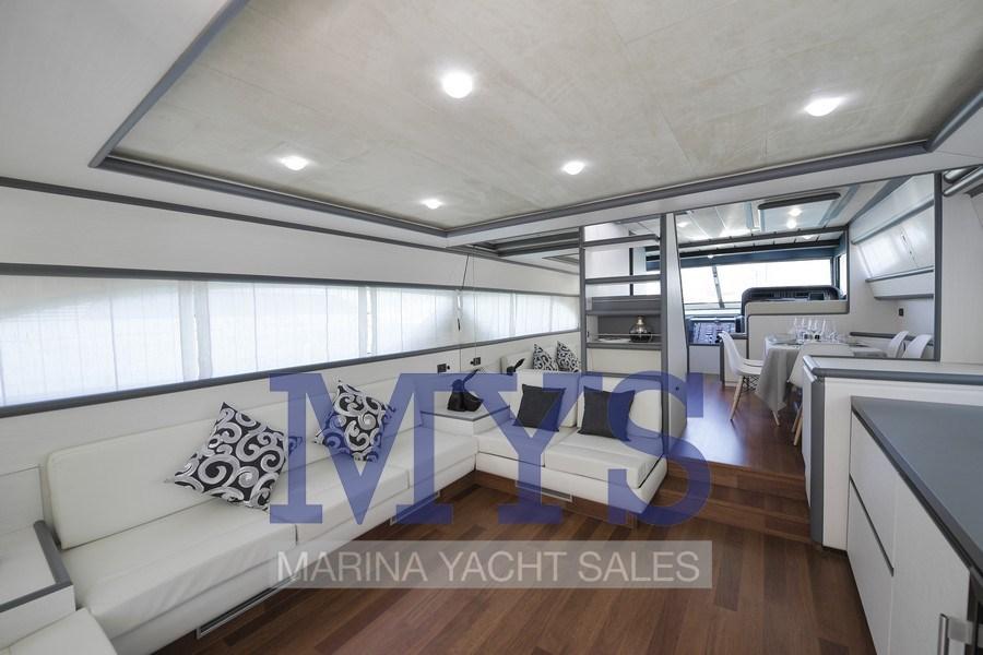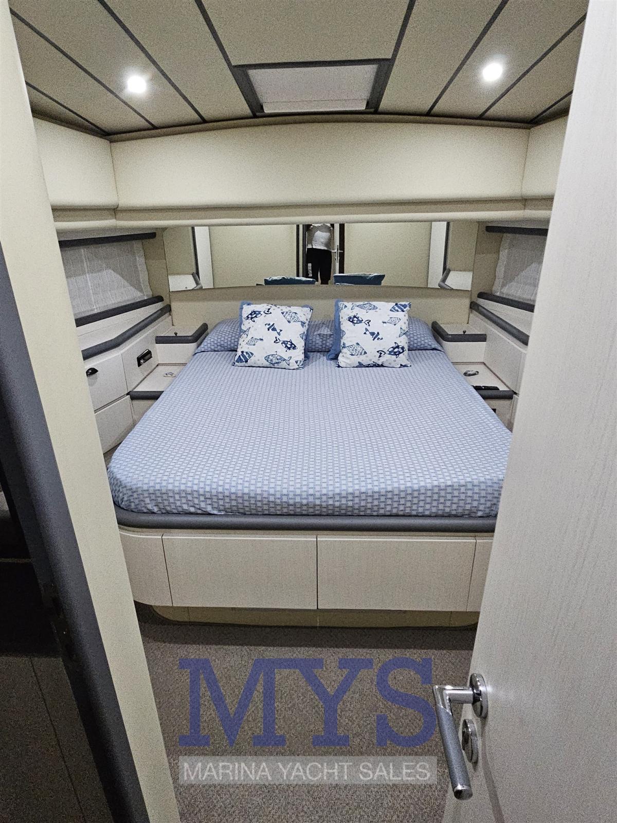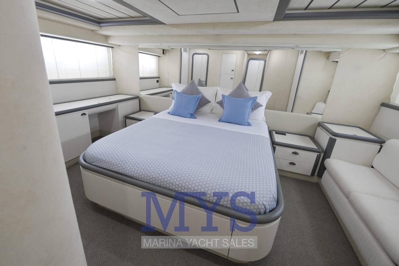 Alarme moteur, Douche de cockpit, Double barre à roue, Flaps hydrauliques, Grue de flybridge, Extincteur(s) fixe(s), Indicateurs de flaps, Lavage de chaine, Éclairage de courtoisie, Spots sous-marins, Passerelle, Plateforme arrière, Pompe de cale automatique, Porte latérale, Porte latérale, Cockpit en teck, Prise de quai, Connexion eau sous pression à quai, Onduleur, Répétiteur électronique, Rollbar, Guindeau électrique, Echelle de bain, table de cockpit, Corne.