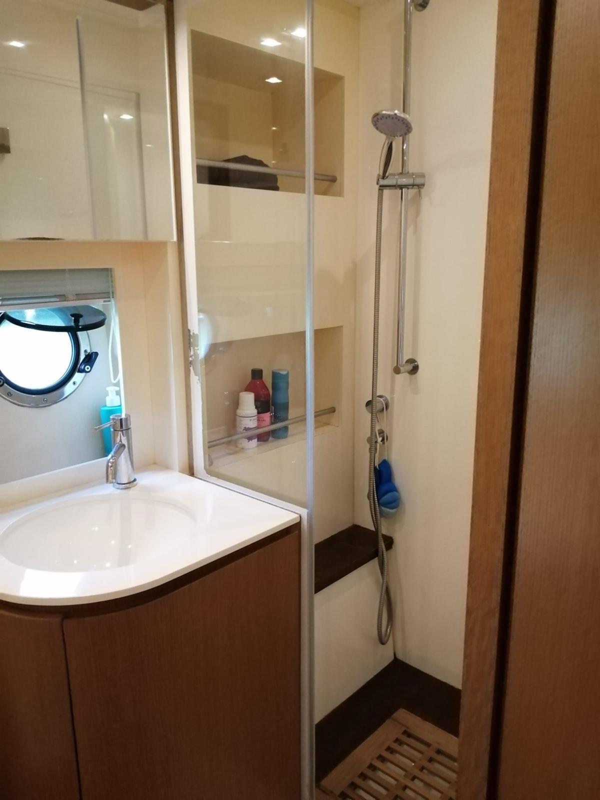 CABINE VIP À L’AVANT AVEC LIT DOUBLE ET SALLE DE BAIN ATTENANTE AVEC CABINE DE DOUCHE