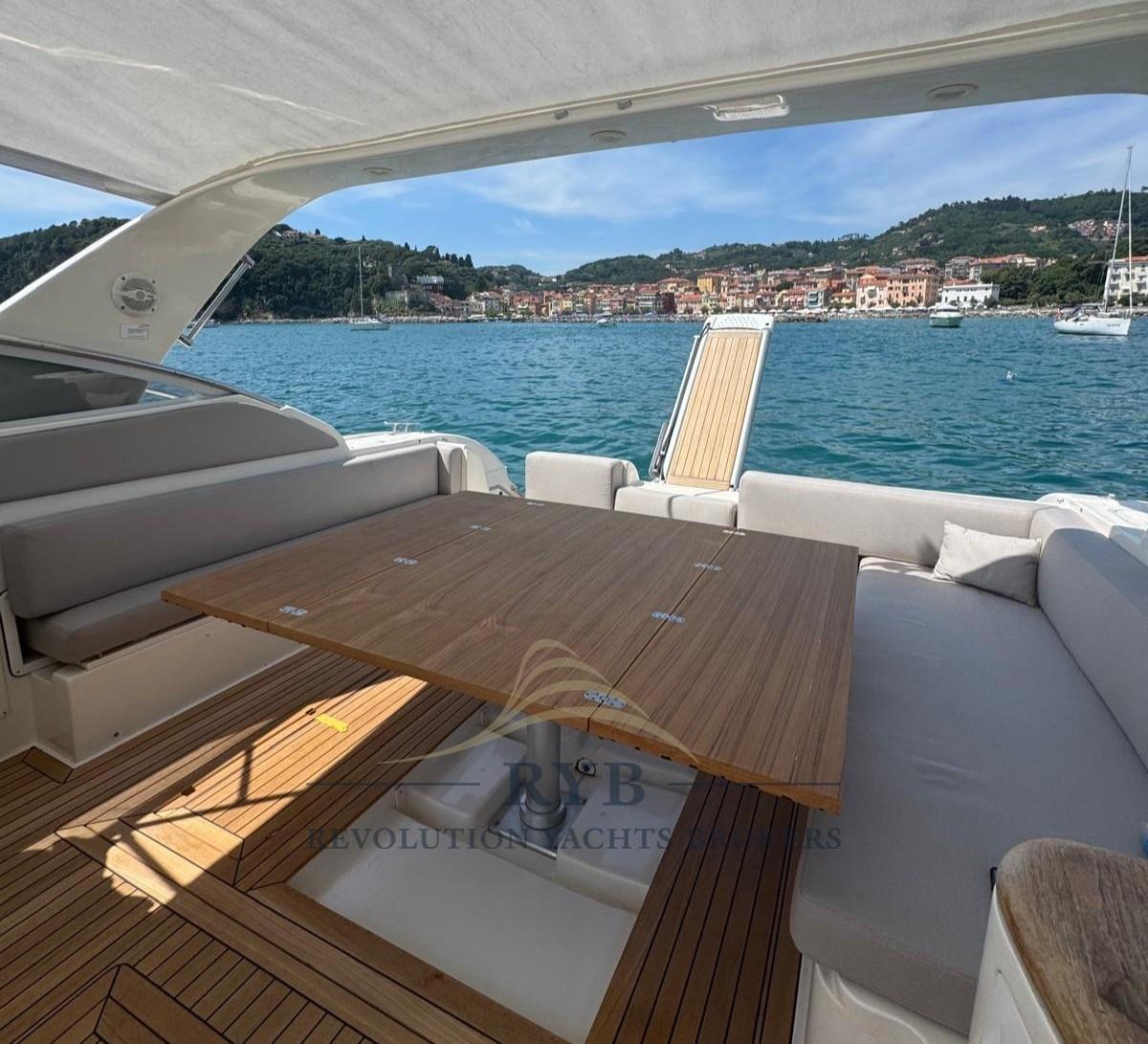 Alarme moteur, Eau sous pression, Douche de cockpit (DI PRUA NUOVA 2025), Propulseur d'étrave (NUOVA), Phare de poursuite, Flaps hydrauliques, Lavabo dans le cockpit, Éclairage de courtoisie, Passerelle, Plateforme arrière (TEAK), Pompe de cale manuelle, Cockpit en teck (NUOVO), Prise de quai, Onduleur, Rollbar, Guindeau électrique (NUOVO CON CATENA), Echelle de bain, table de cockpit (MECCANISMO SALI-SCENDI).