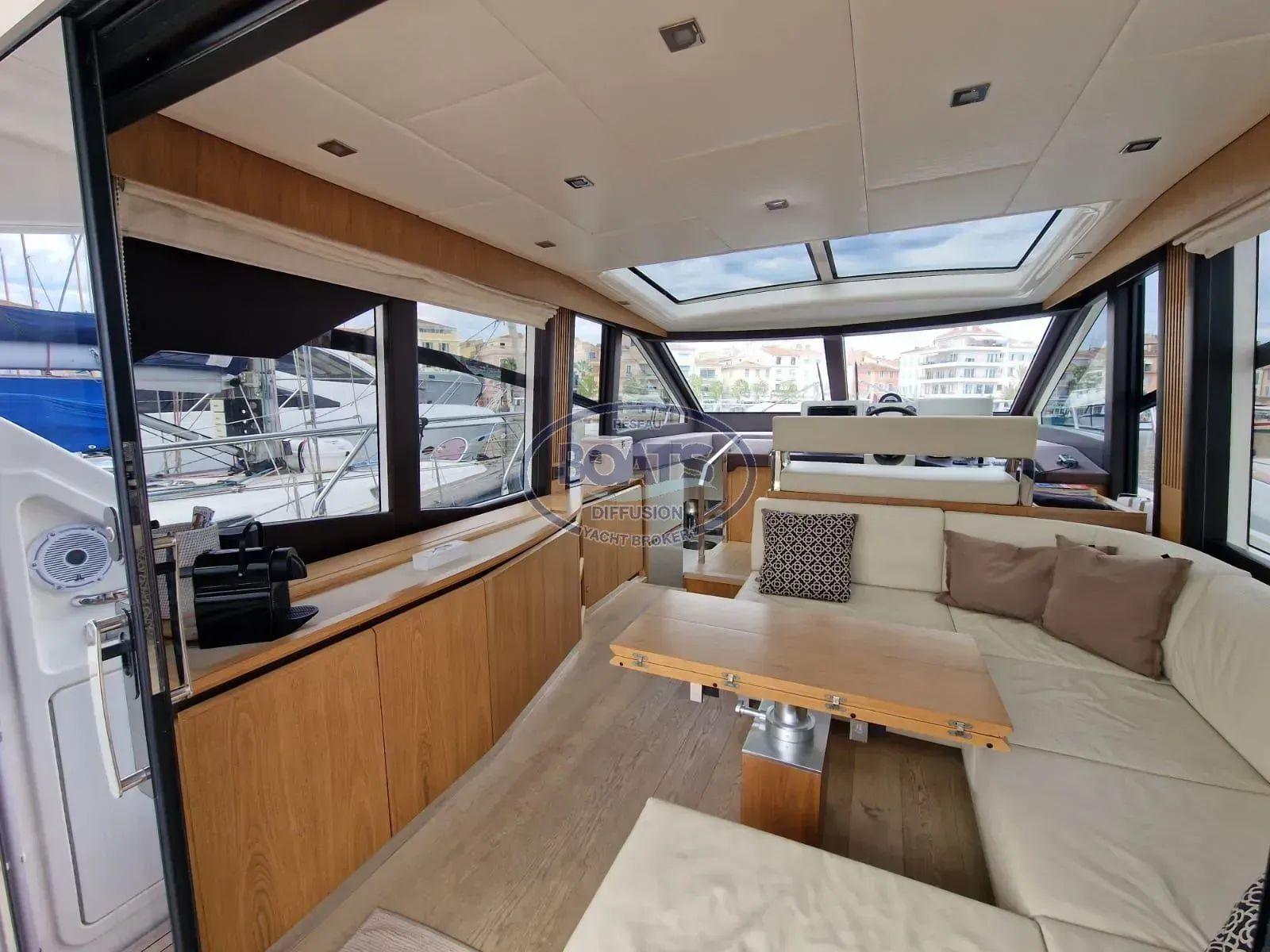 L'Absolute 43 STY redéfinit l'espace. Son salon baigné de lumière communique de plain-pied avec le cockpit arrière grâce à sa large baie vitrée escamotable, créant un espace de vie immense et fluide.