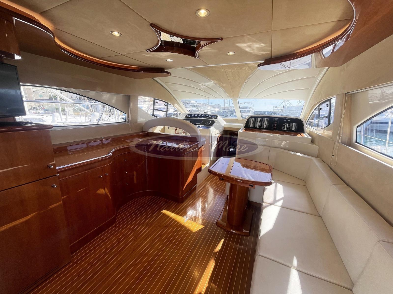 Alarme moteur, Alarme de pompe de cale, Alternateur, Eau sous pression, Taquets pliants (a poppa a scomparsa con winch tonneggio lato dritto), Chargeur de batterie (Quick), Câble d’alimentation à quai, Filères, Douche de cockpit (nel pozzetto con miscelatore acqua c/f), Double barre à roue (interna ed esterna sul fly), Propulseur de poupe (Quick), Propulseur d'étrave (Quick), Phare de poursuite (di profondità sul fly), 2 Flaps hydrauliques (Bennett), Grue pour jet-ski (tramite la passerella di poppa), Extincteur(s) fixe(s), Indicateurs de flaps, Lavabo dans le cockpit, Éclairage de courtoisie, Moniteur de batterie, Moteur hors-bord pour annexe (Mercury 6 hp), Défenses, Passerelle (idraulica Besenzoni, acciaio verniciato bianco e teak, lunghezza 3 mt., sollevamento 300 kg. con comando a distanza), Plateforme arrière (ampia, a filo pozzetto con rivestimento in teak e doppio cancellino inox di accesso al pozzetto), Pompe de Vidange du Réservoir d’Eaux Usées, Pompe de cale automatique, Pompe de cale manuelle, Porte latérale (acciaio e vetro), Cockpit en teck (con divano e grande tavolo in teak abbattibile), Prise de quai, Connexion eau sous pression à quai, Répétiteur électronique (sul fly), Rollbar (sul fly con antenne), Guindeau électrique (con àncora e catena e winch di tonneggio con comando a pulsante), Echelle de bain (a scomparsa nella piattaforma bagno a poppa con azionamento elettrico), Système de filtration des eaux usées, table de cockpit (grande, abbattibile), Annexe (Honda 240 cm. con scafo in vetroresina, portata 3 persone, completo di motore Mercury 6 hp), Corne, Winch électrique arrière (lato dritto), Winch électrique avant (sul verricello dell'àncora).