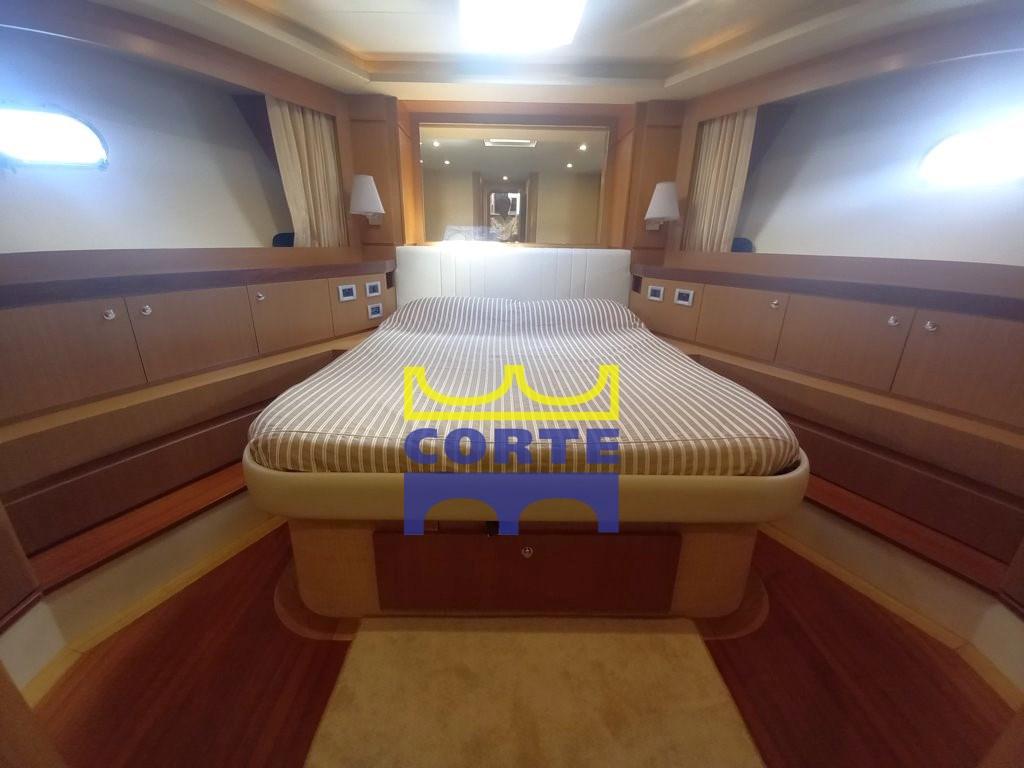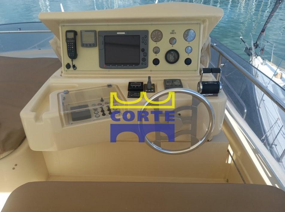 stabilisateurs gyroscopiques, troisième poste de pilotage dans le cockpit, plate-forme arrière en teck (élévateur d’annexe), table télescopique à l’avant avec bain de soleil, lumières étanches sous la plate-forme, ouverture latérale de la chaire, doubles stores romains dans le salon, éclairage de la passerelle latérale, TV LCD 26" avec ascenseur électrique, congélateur à tiroirs, haut-parleurs amplifiés par paires sur le flybridge, dôme vide, hotte aspirante au-dessus des brûleurs de cuisine, housses de coussin externes complètes de couleur rouf.