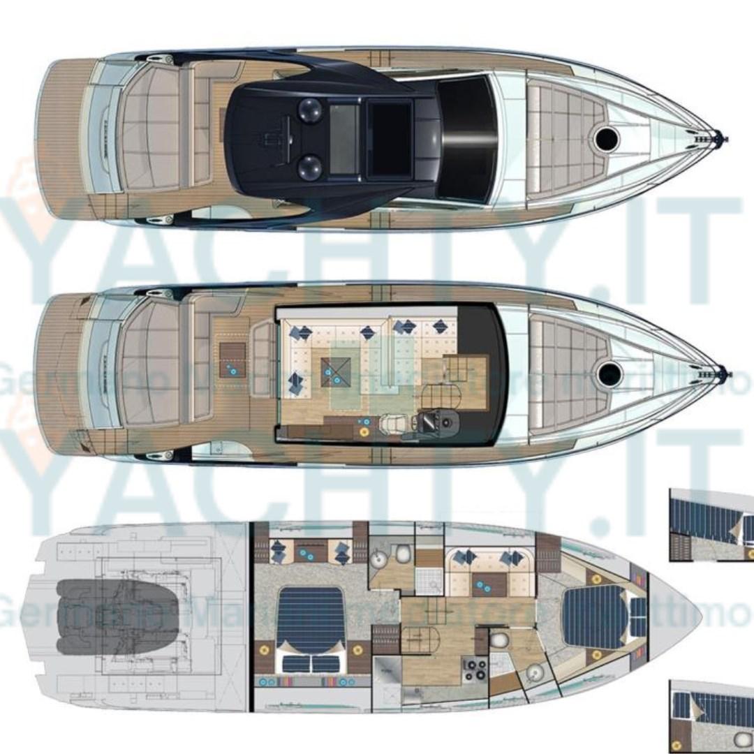 L’équipement complet en option du plus haut niveau comprend un stabilisateur gyroscopique Seakeeper, une passerelle hydraulique rétractable, une plateforme de nage hydraulique, un teck complet sur toutes les passerelles extérieures et l’électronique embarquée Garmin avec radar et pilote automatique.