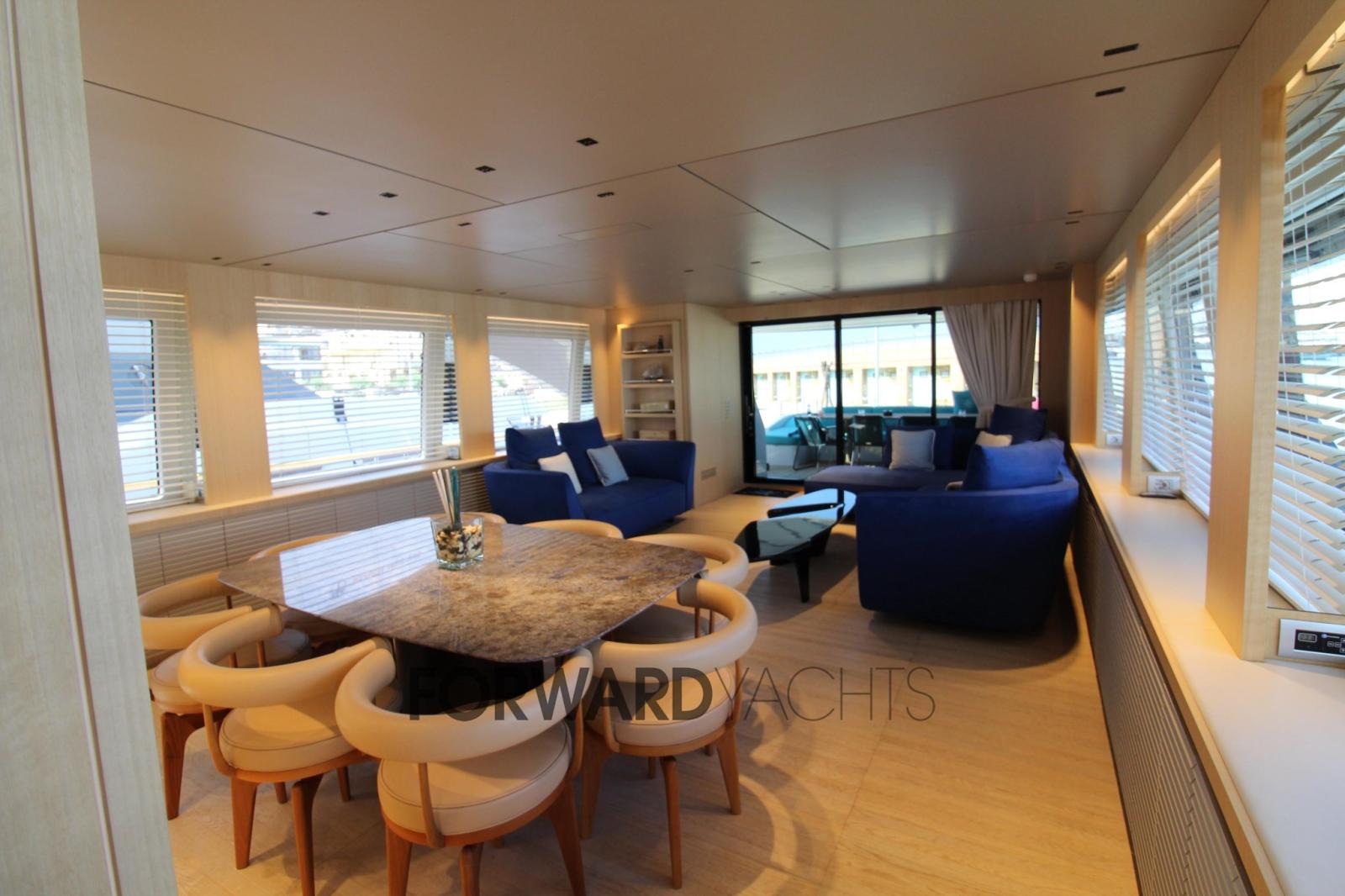 Ce superyacht en particulier dispose d’un salon lumineux et confortable avec des fenêtres panoramiques et de grands espaces extérieurs. La passerelle d’appui comprend une table à manger, une terrasse solaire et un jacuzzi. Équipé de 4 moteurs Volvo Penta IPS de 1 200 ch, pour une vitesse maximale de 27 nœuds et une navigation confortable à 23 nœuds, garantissant une efficacité exceptionnelle, une faible consommation de carburant et une maniabilité.