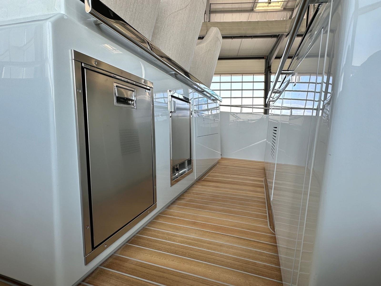 Montants du hard-top : Barcares Yachting vous propose la version avec deux poteaux inox (au lieu du V central en fibre de verre) pour plus de praticité et un gain de place sur le plan de travail de la cuisine.