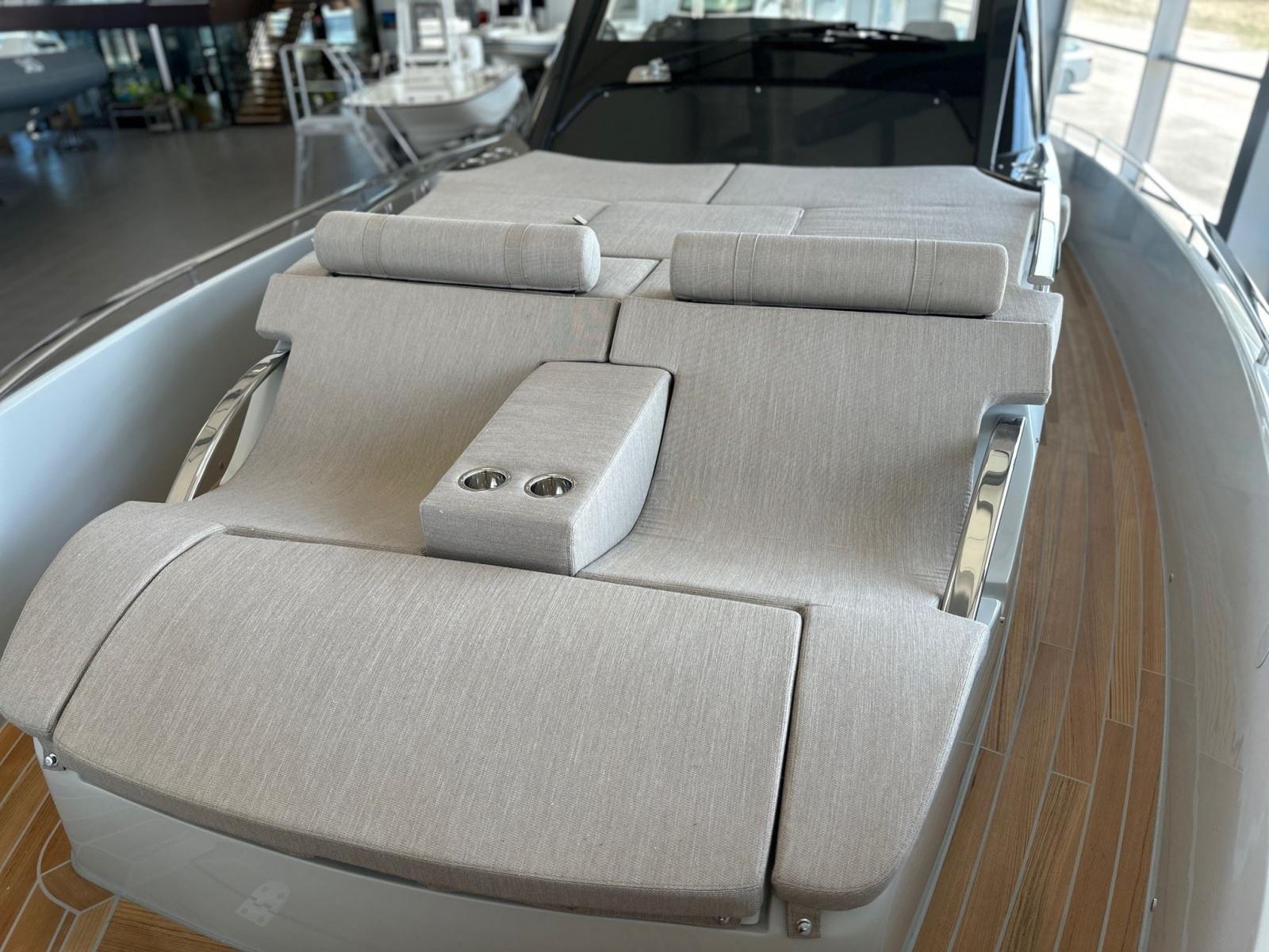 Transats ergonomiques à l'avant : Des transats à l'avant du bateau, conçus pour épouser la forme du dos, offrent un confort optimal pour les bains de soleil.